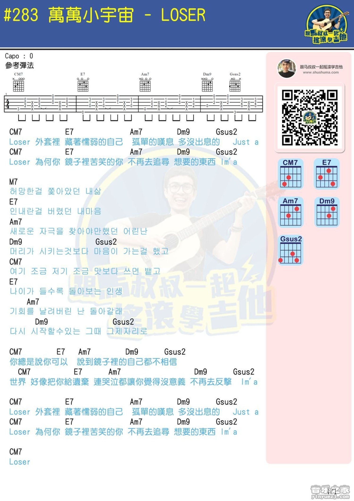 曲谱介绍: 版《loser》吉他和弦弹唱谱