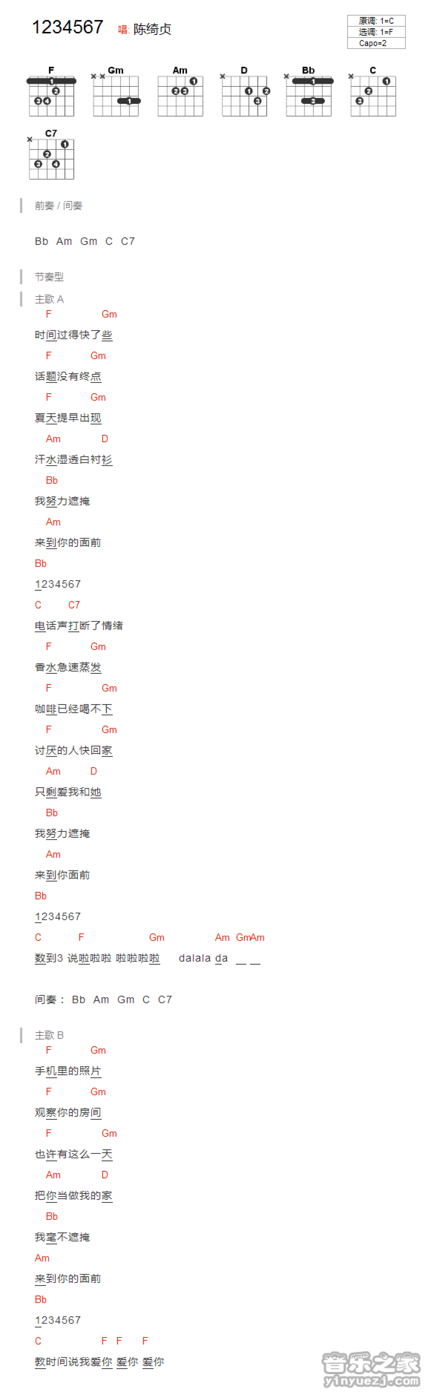 1234567吉他谱 - 陈绮贞 - F调吉他弹唱谱 - 和弦谱