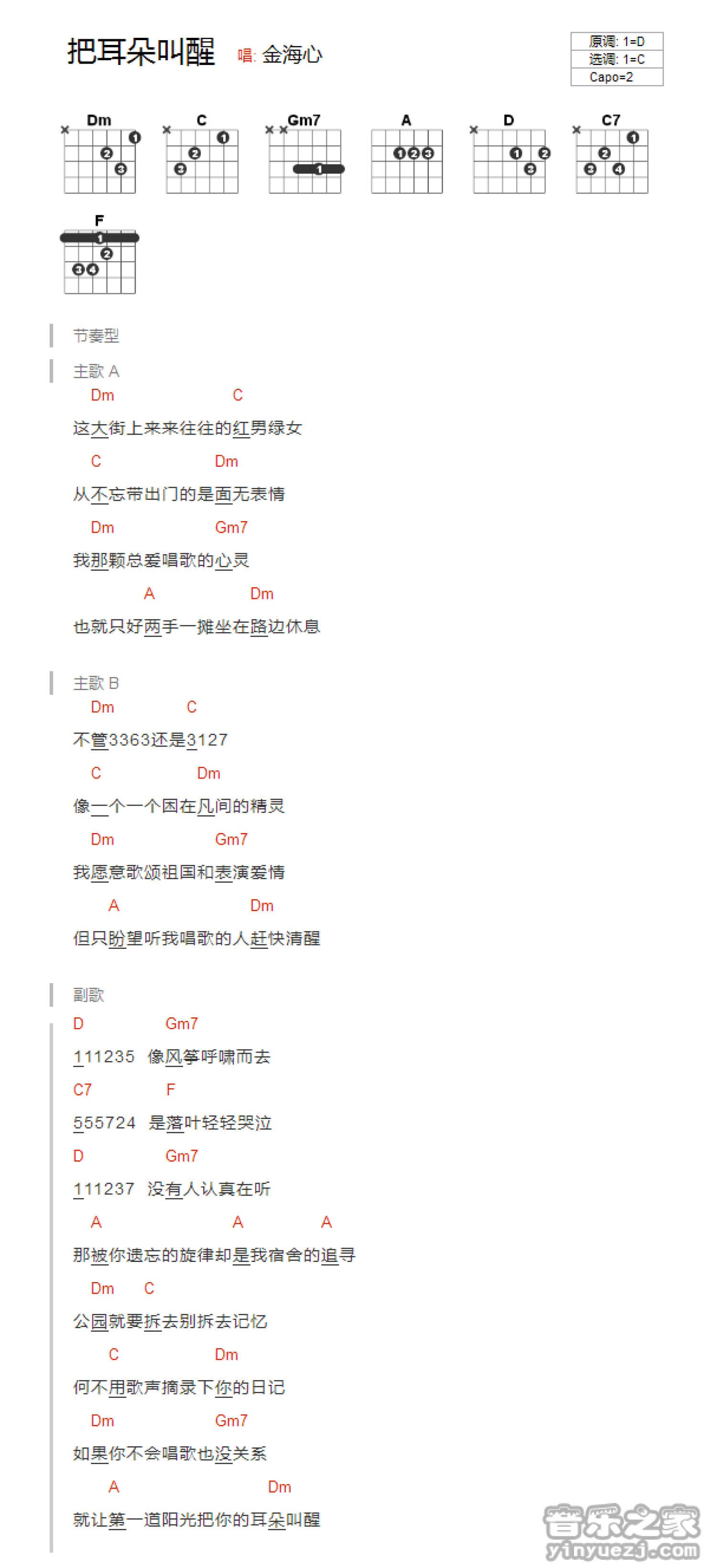 曲谱介绍: C调版《把耳朵叫醒》吉他和弦弹唱谱