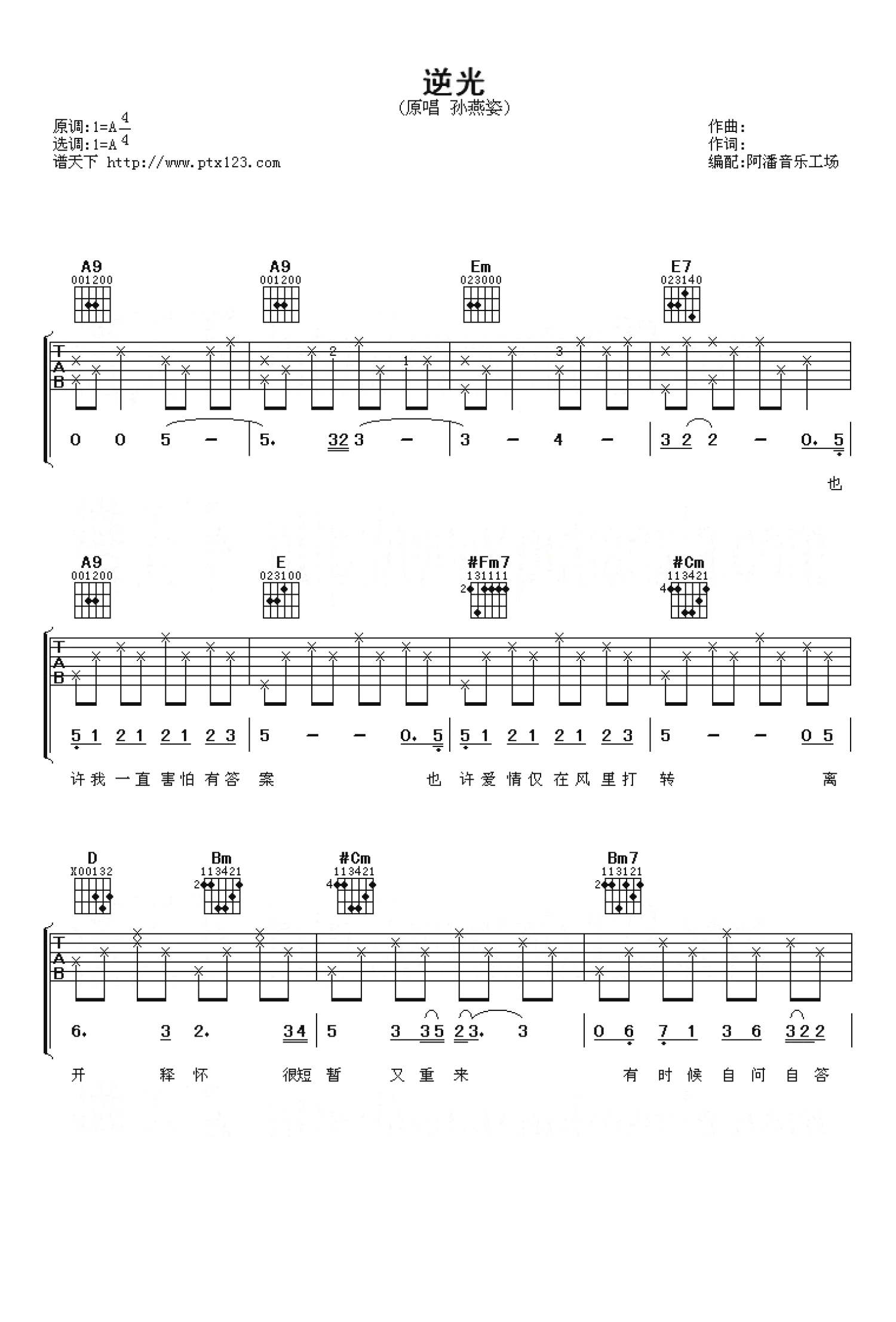 曲谱介绍: 《逆光》吉他谱,A调指法,孙燕姿演唱的一首经典代表歌曲。台湾歌手陈芳语在陆综《创造101》中表现亮眼,于最新一集e与李紫婷、吴映香等人合作,演唱孙燕姿经典歌曲《逆光》,获得一片好评。