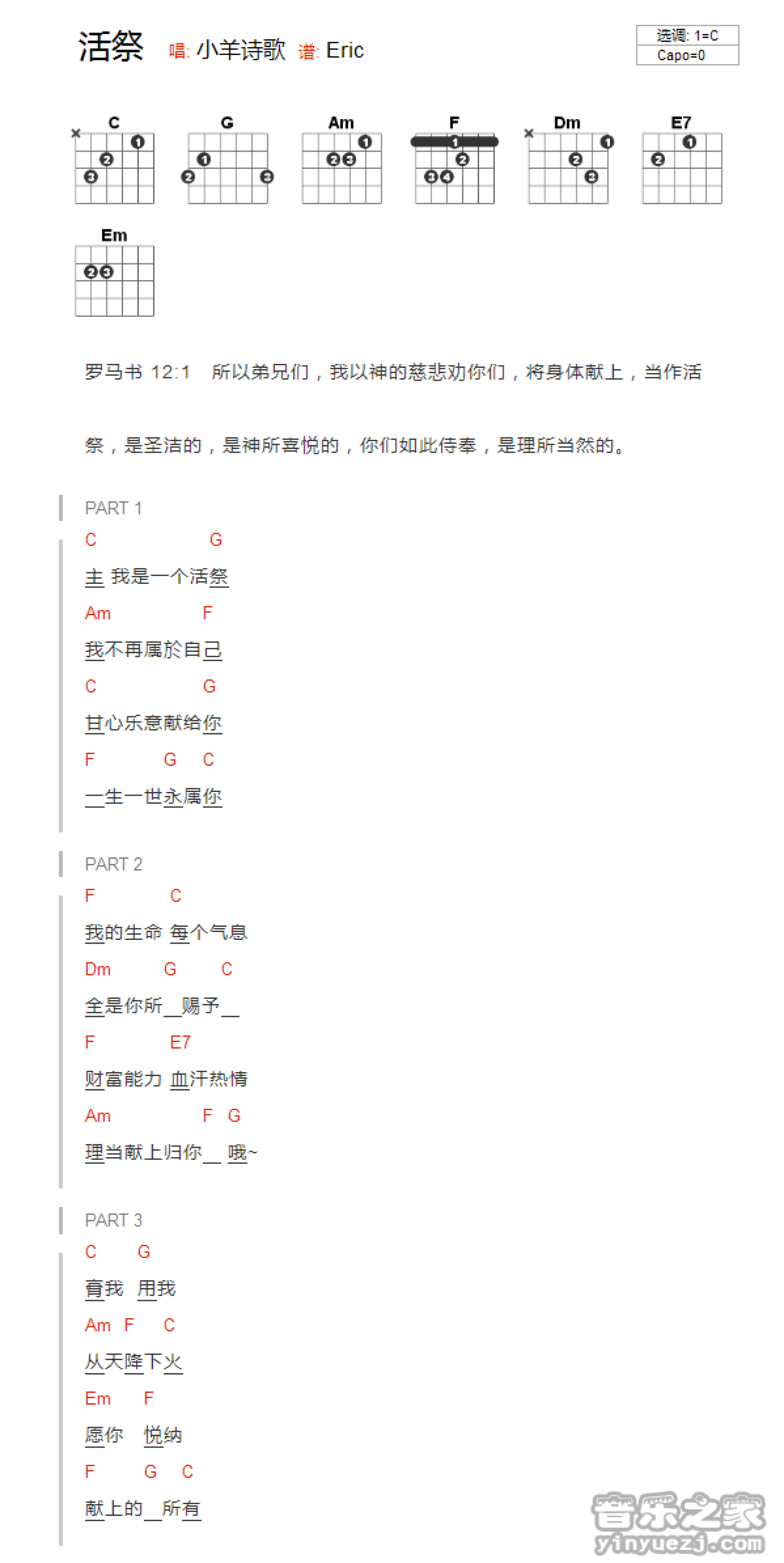 曲谱介绍: C调版《活祭》吉他谱_和弦弹唱谱