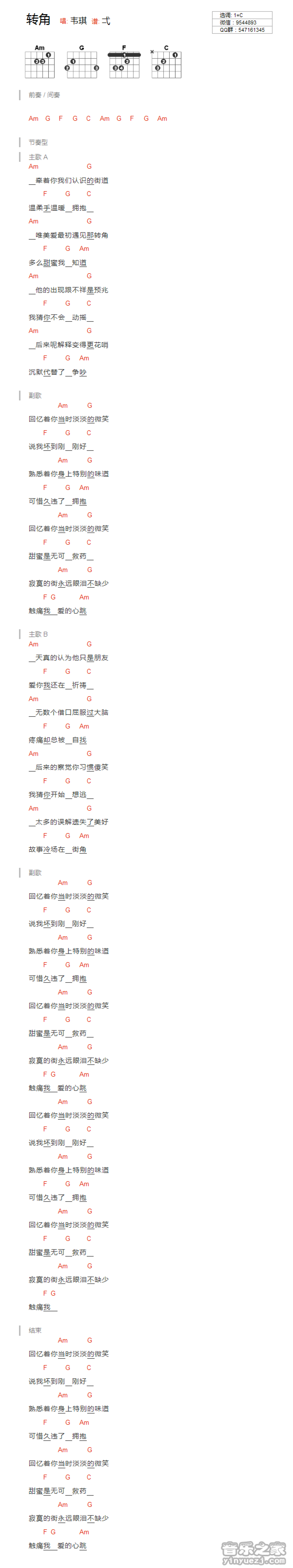转角吉他谱 - 韦琪 - C调吉他弹唱谱 - 和弦谱