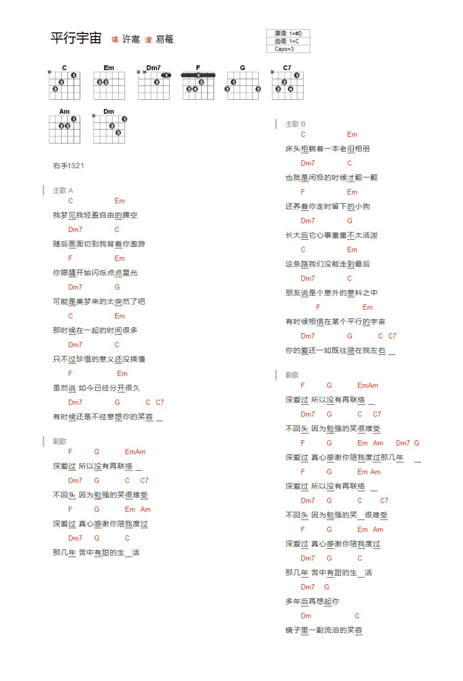 曲谱介绍: C调版《平行宇宙》吉他和弦弹唱谱