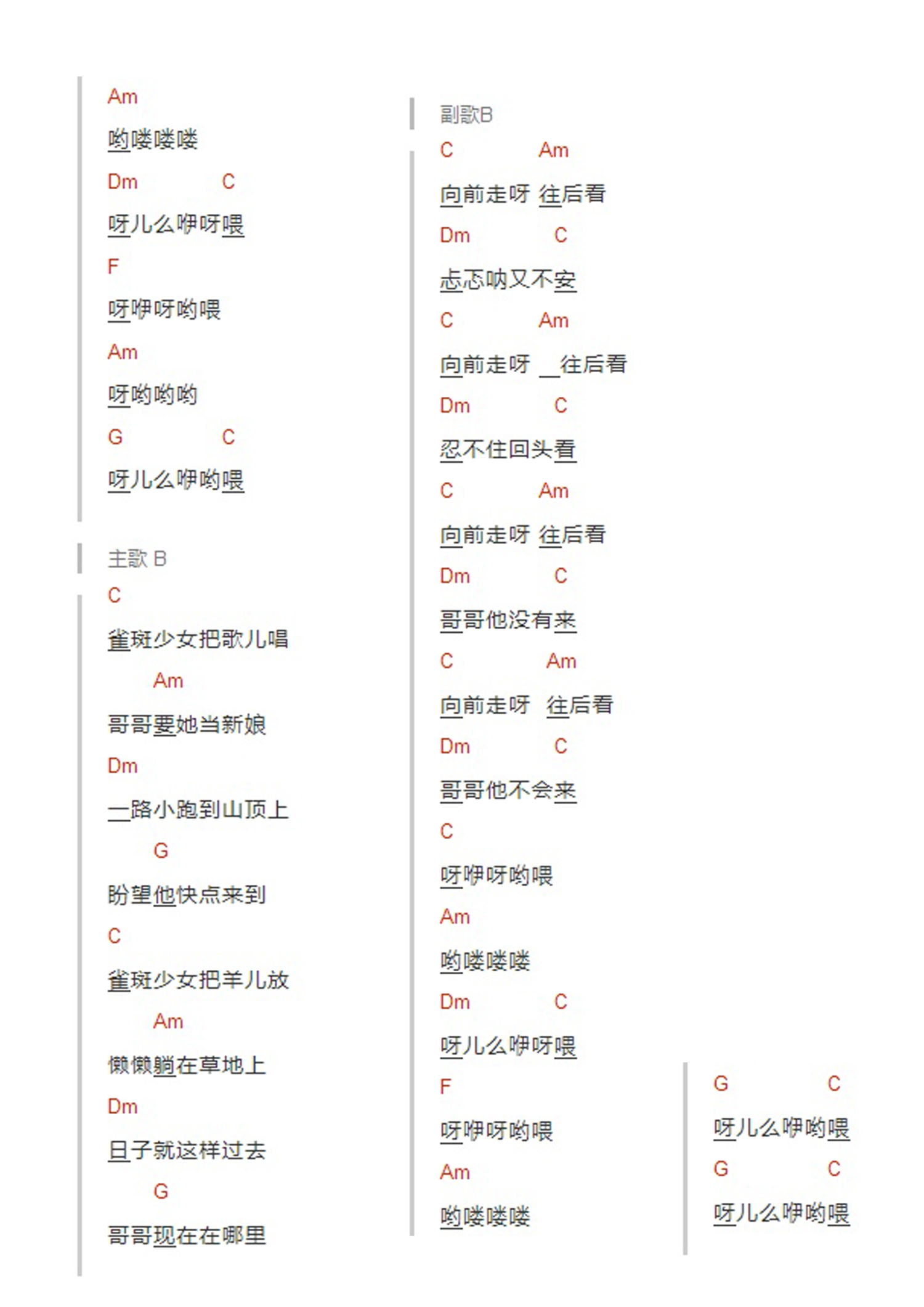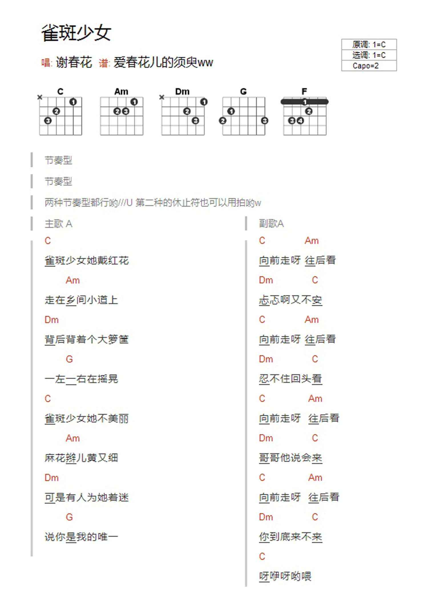雀斑少女吉他谱 - 谢春花 - C调吉他弹唱谱 - 和弦谱