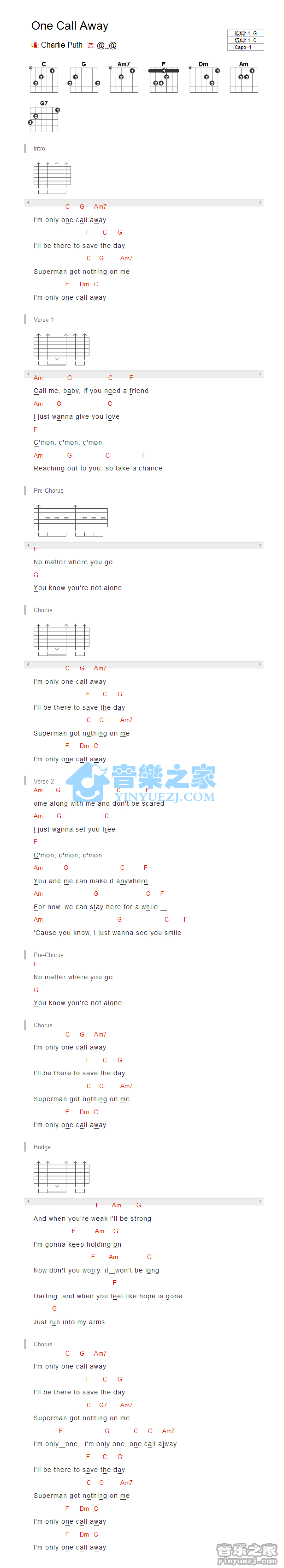 曲谱介绍: C调版《OneCallWay》吉他和弦弹唱谱