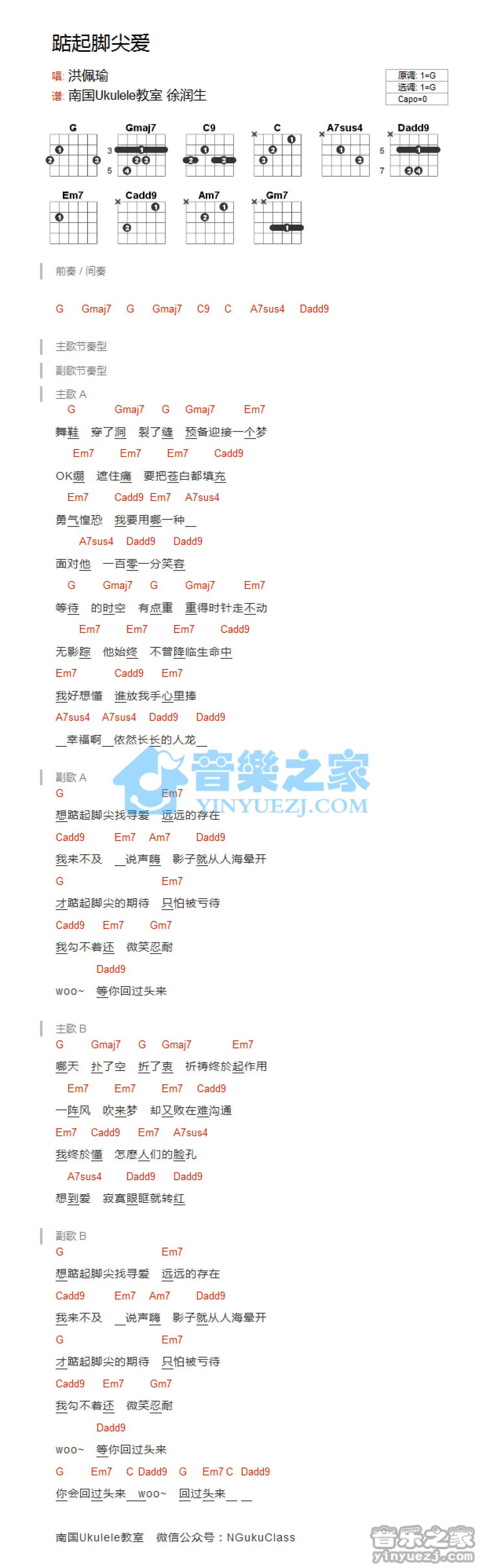 曲谱介绍: G调版《踮起脚尖的爱》吉他和弦弹唱谱