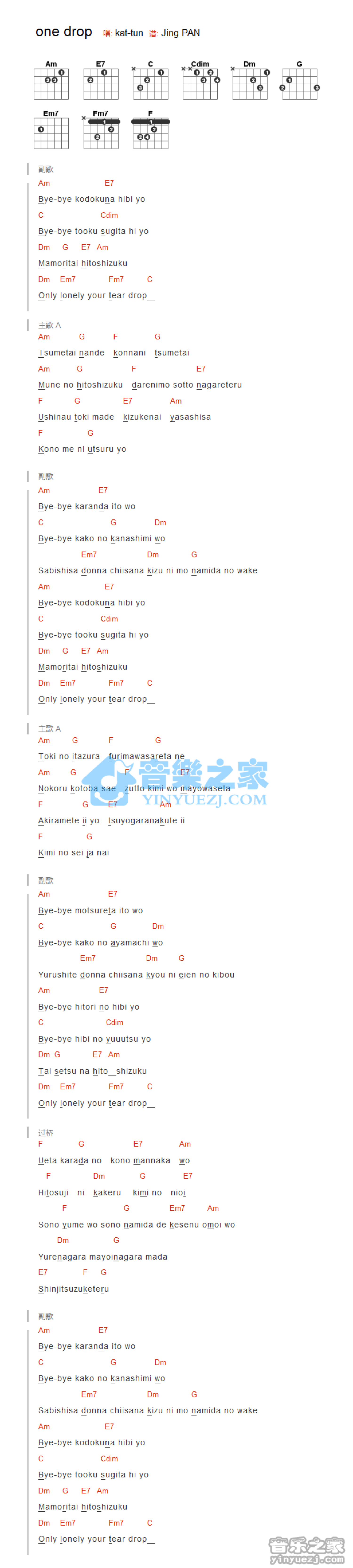 one drop吉他谱 - kat-tun - C调吉他弹唱谱 - 和弦谱