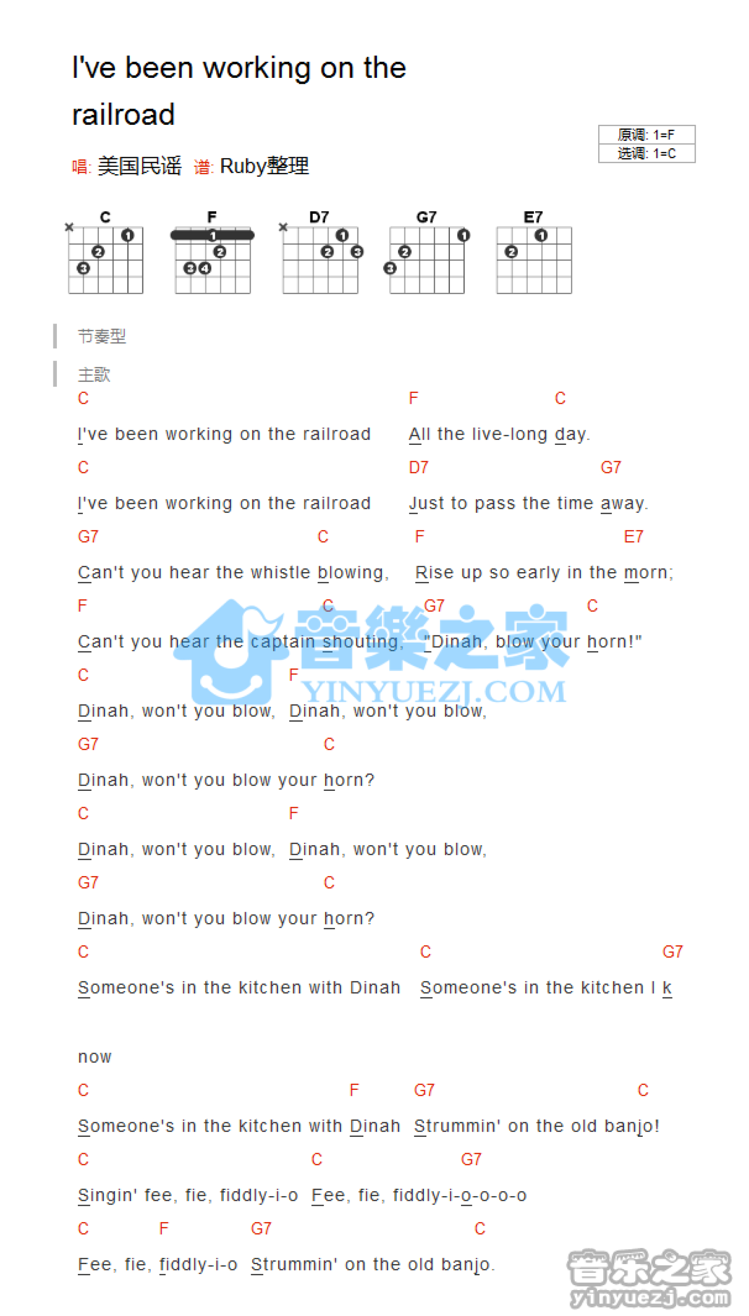 曲谱介绍: 《I'vebeenworkingontherailroad》吉他和弦弹唱谱
