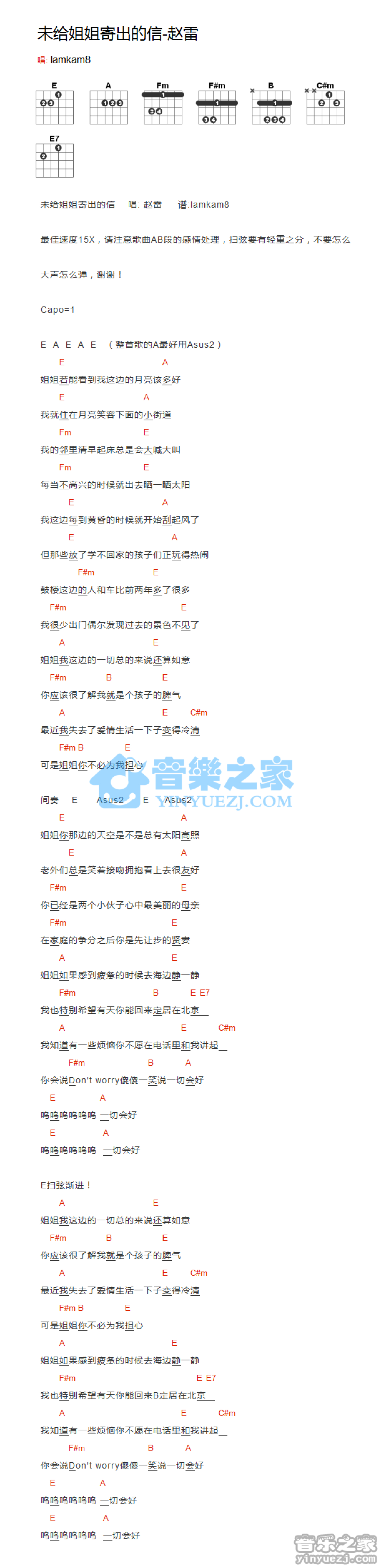 曲谱介绍: 《未给姐姐寄出的信》吉他和弦弹唱谱