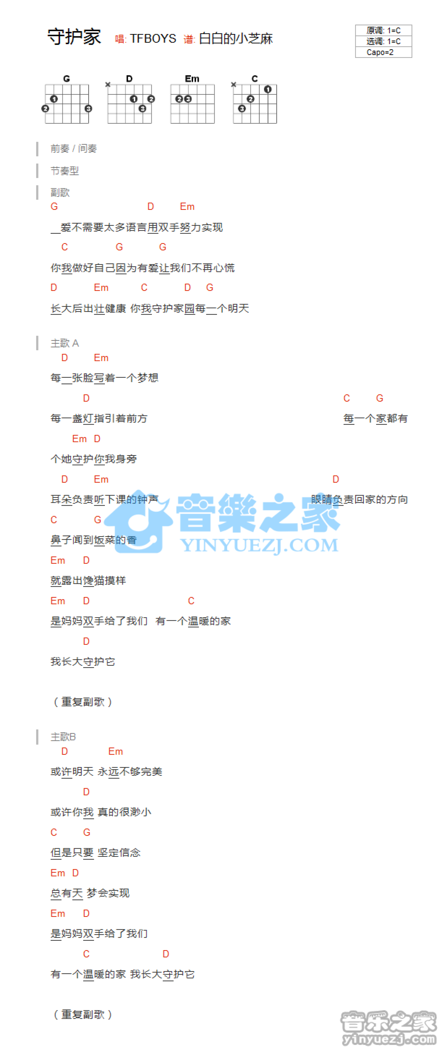 曲谱介绍: C调版《守护家》吉他和弦弹唱谱