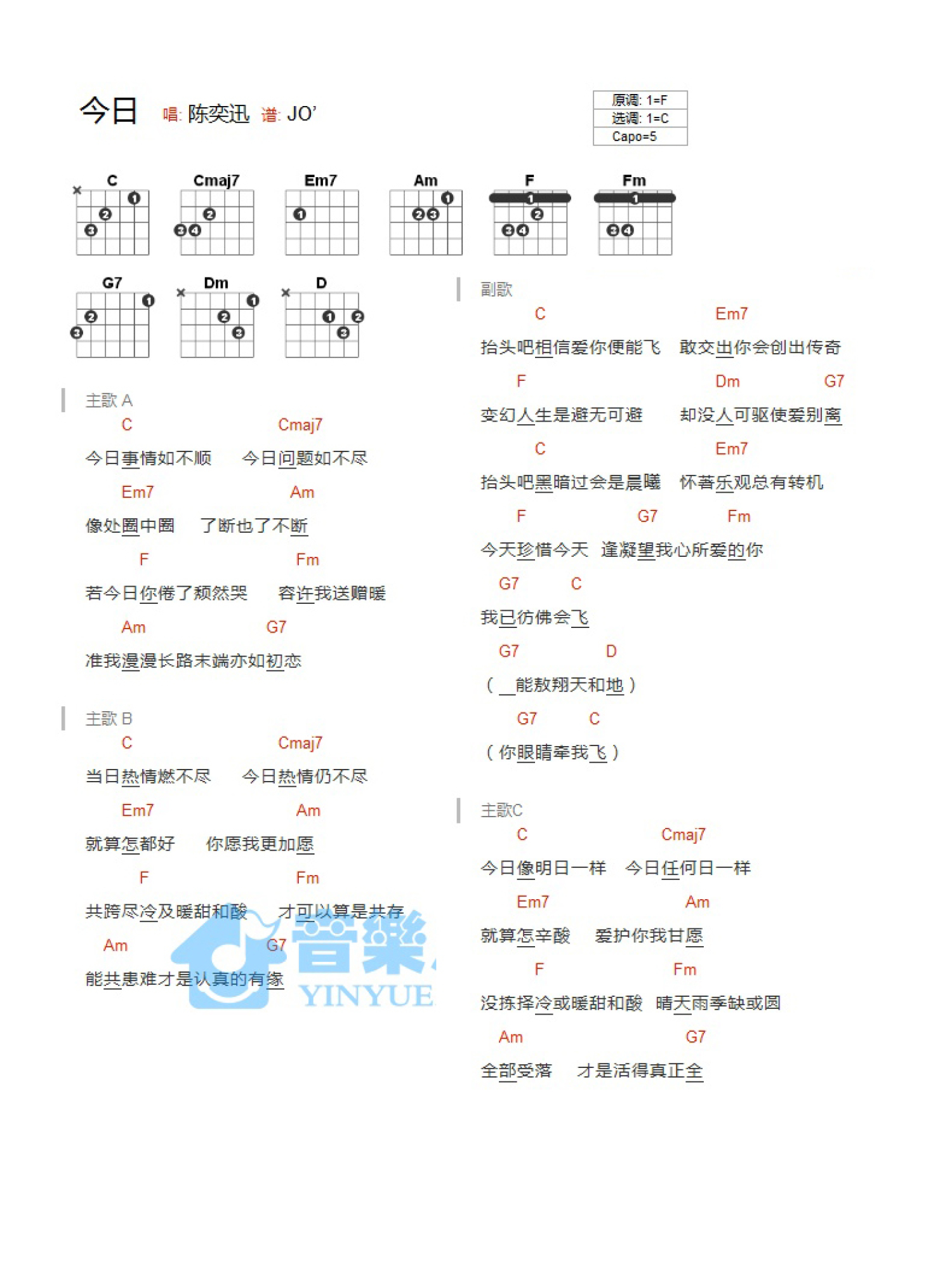 今日吉他谱 - 陈奕迅 - C调吉他弹唱谱 - 和弦谱
