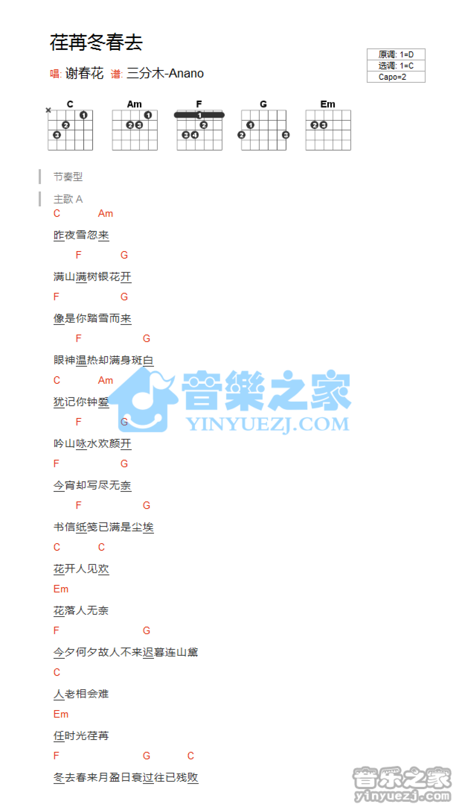 曲谱介绍: C调版《荏苒冬春去》吉他和弦弹唱谱