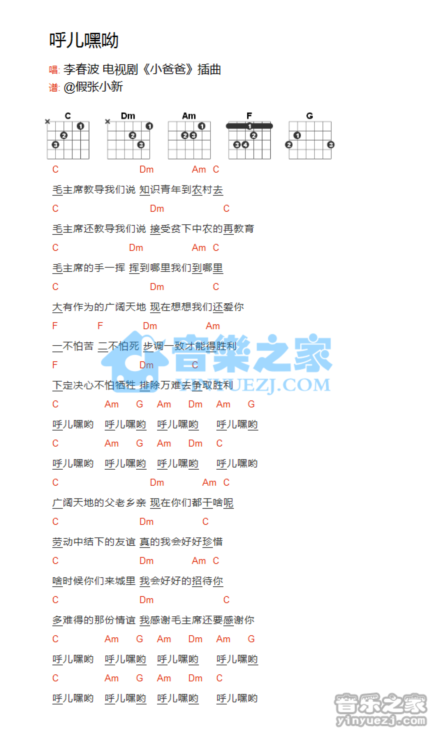 曲谱介绍: 《呼儿嘿哟》吉他和弦弹唱谱