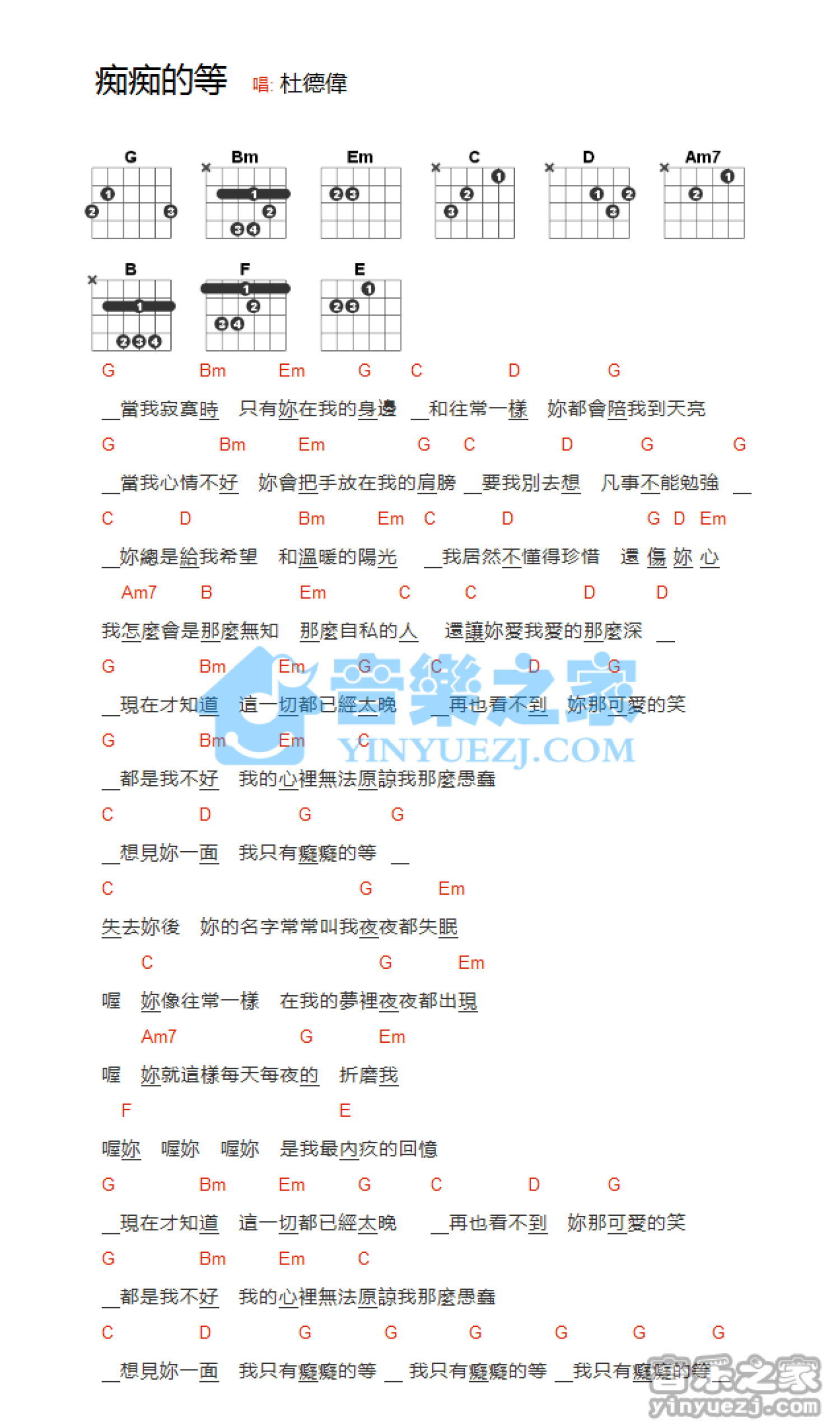 曲谱介绍: 《痴痴地等》吉他和弦弹唱谱