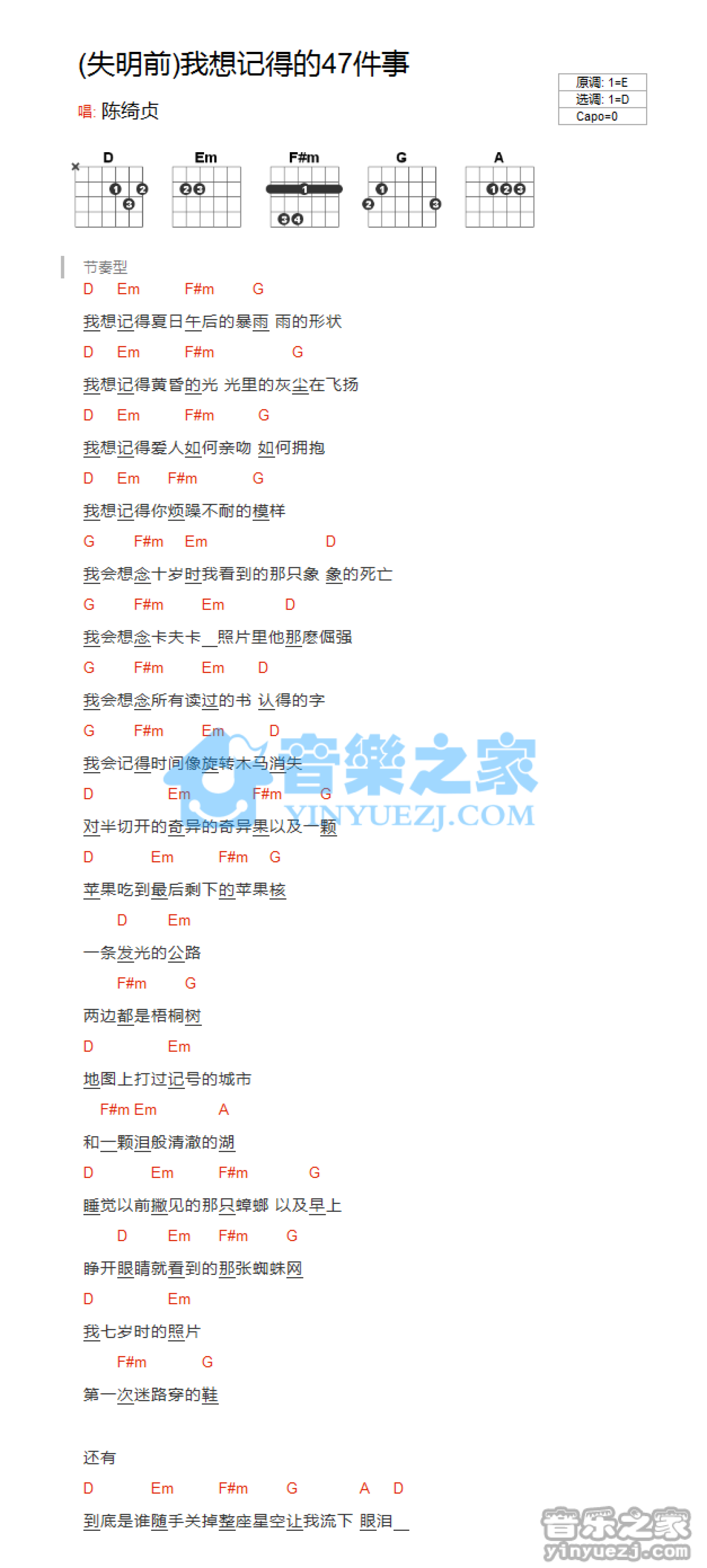 失明前我想记得的47件事吉他谱 - 陈绮贞 - D调吉他弹唱谱 - 和弦谱