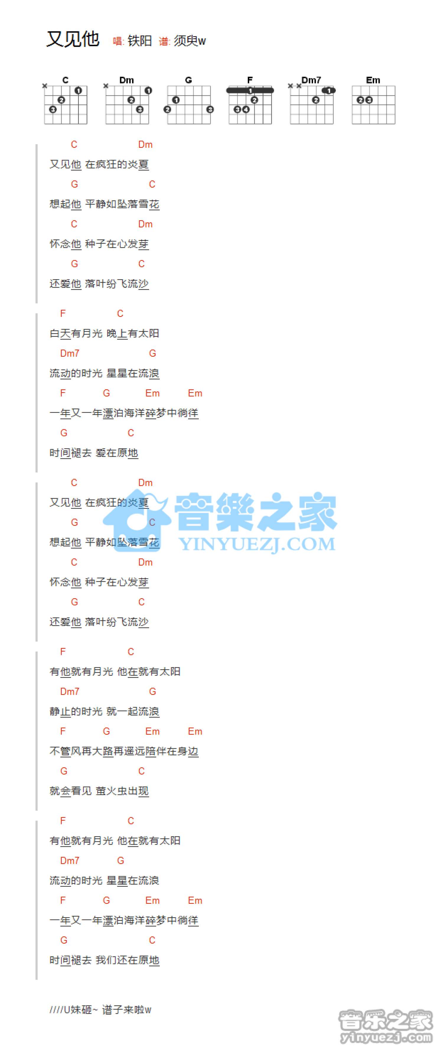 曲谱介绍: 《又见他》吉他和弦弹唱谱