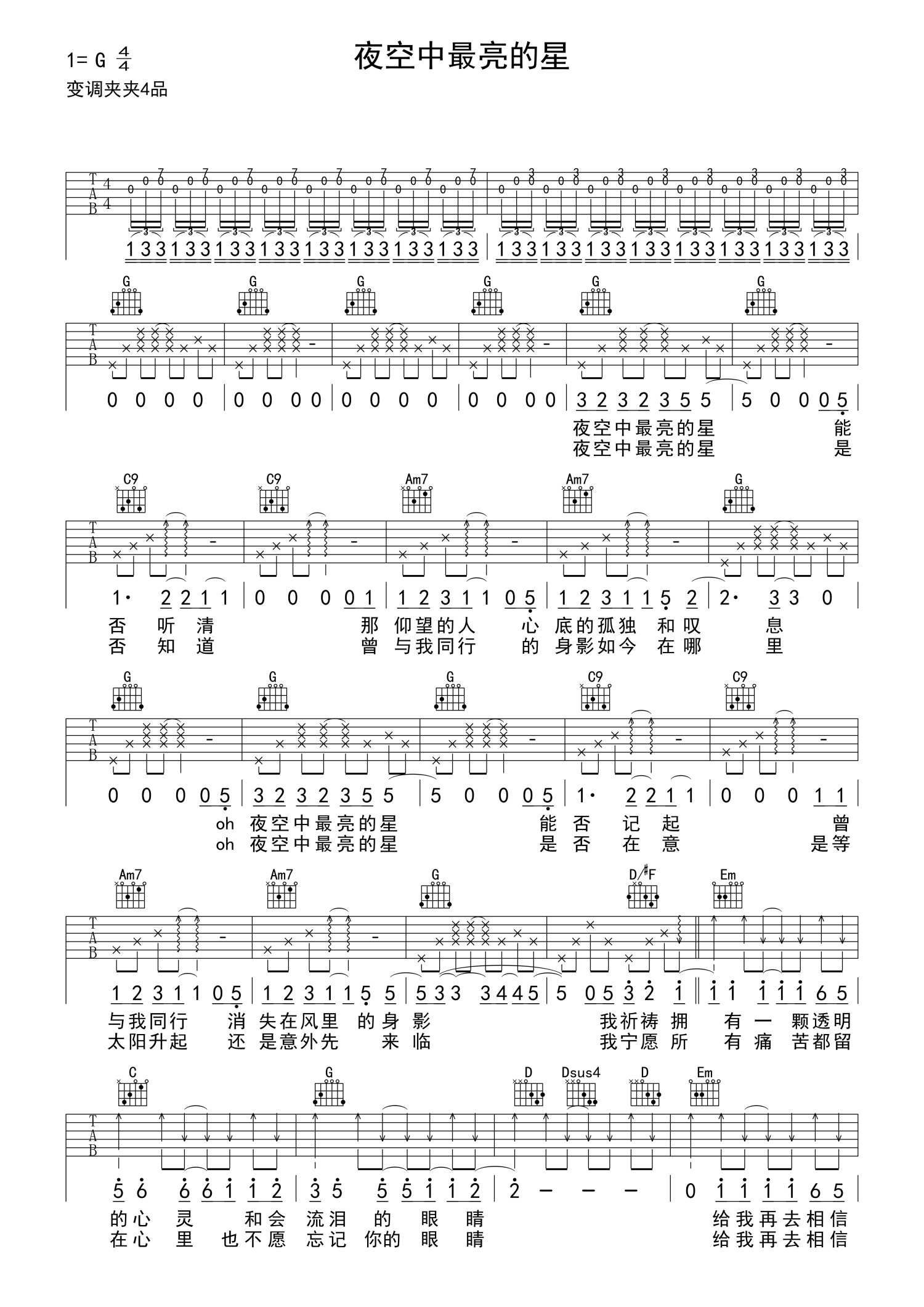 曲谱介绍: 《夜空中最亮的星》逃跑计划G调吉他谱_吉他六线谱_图片谱变调夹4品