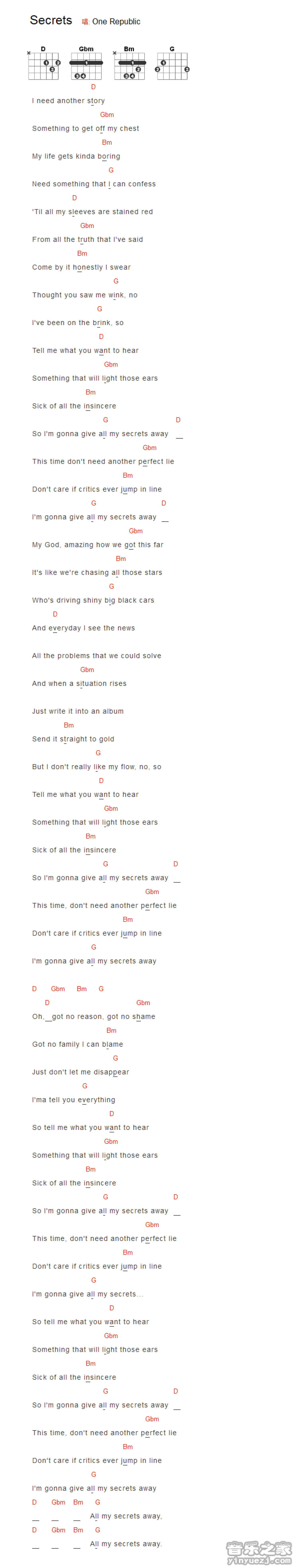 曲谱介绍: 《Secrets》吉他和弦弹唱谱