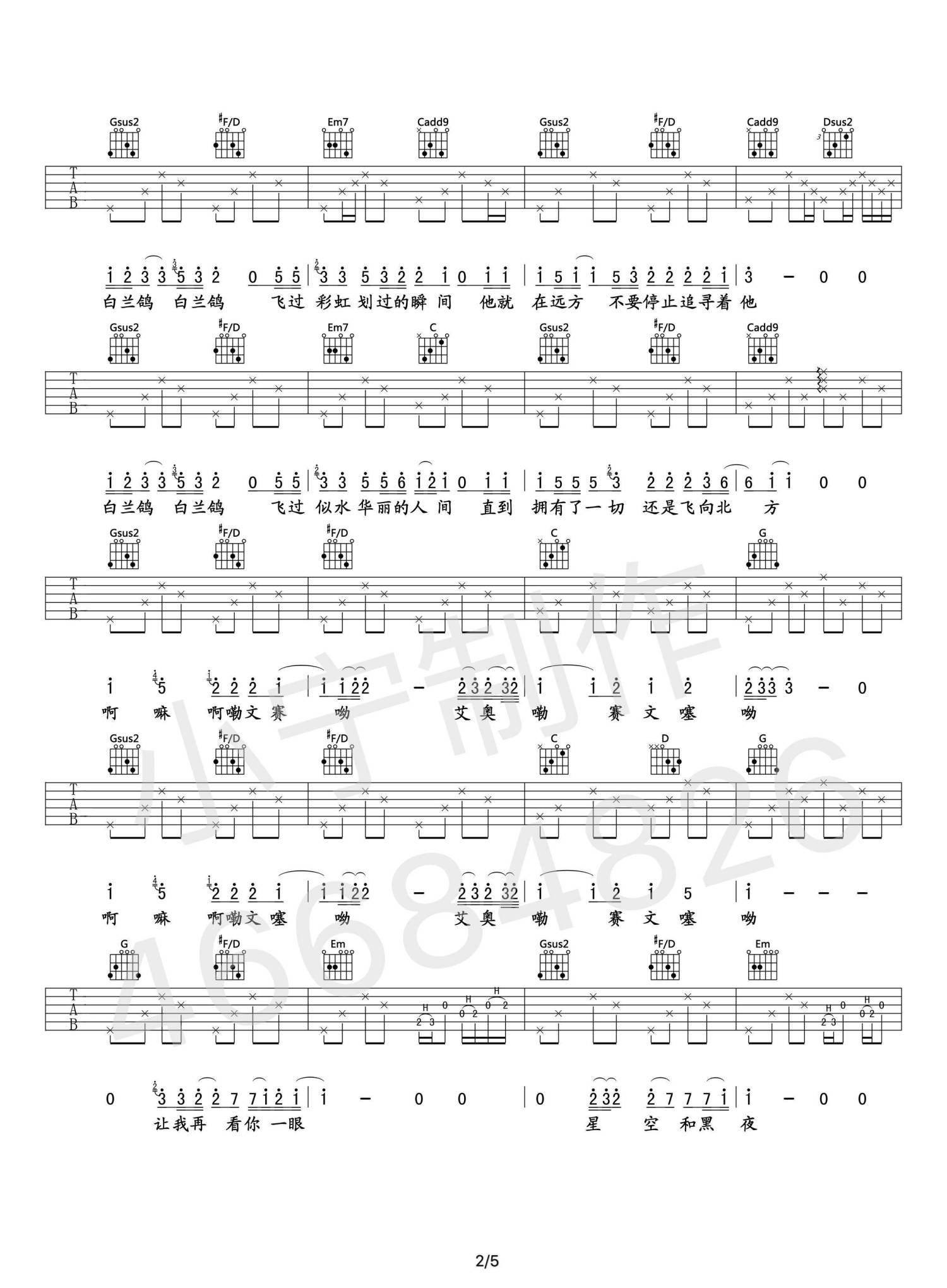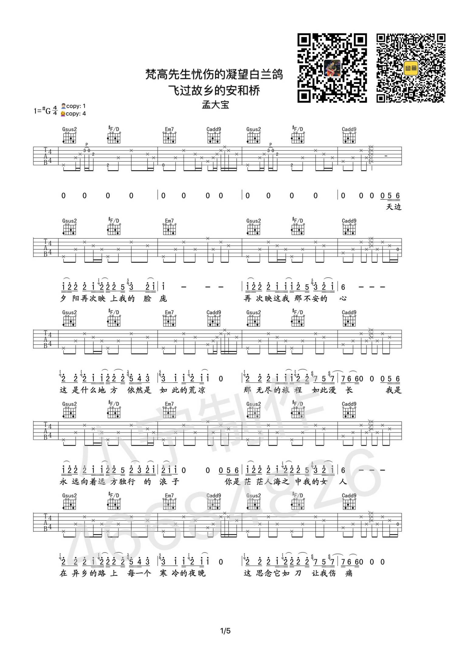 曲谱介绍: 《梵高先生忧伤地凝望着白兰鸽飞过故乡的安河桥》G调吉他谱,男生变调夹1品,女生建议4品。