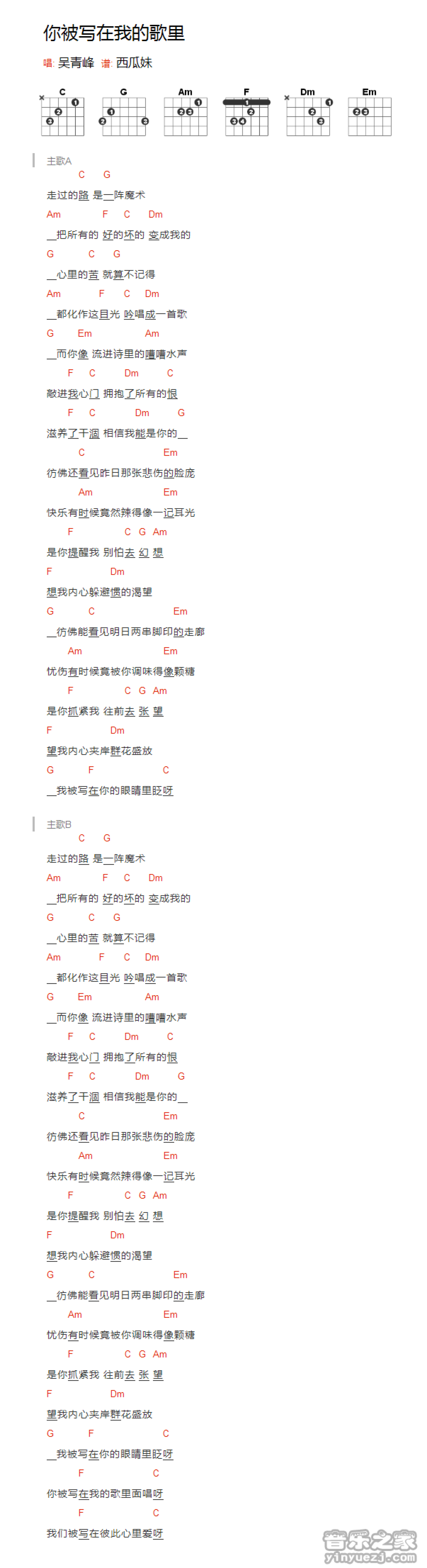 你被写在我歌里吉他谱 - 吴青峰 - C调吉他弹唱谱 - 和弦谱