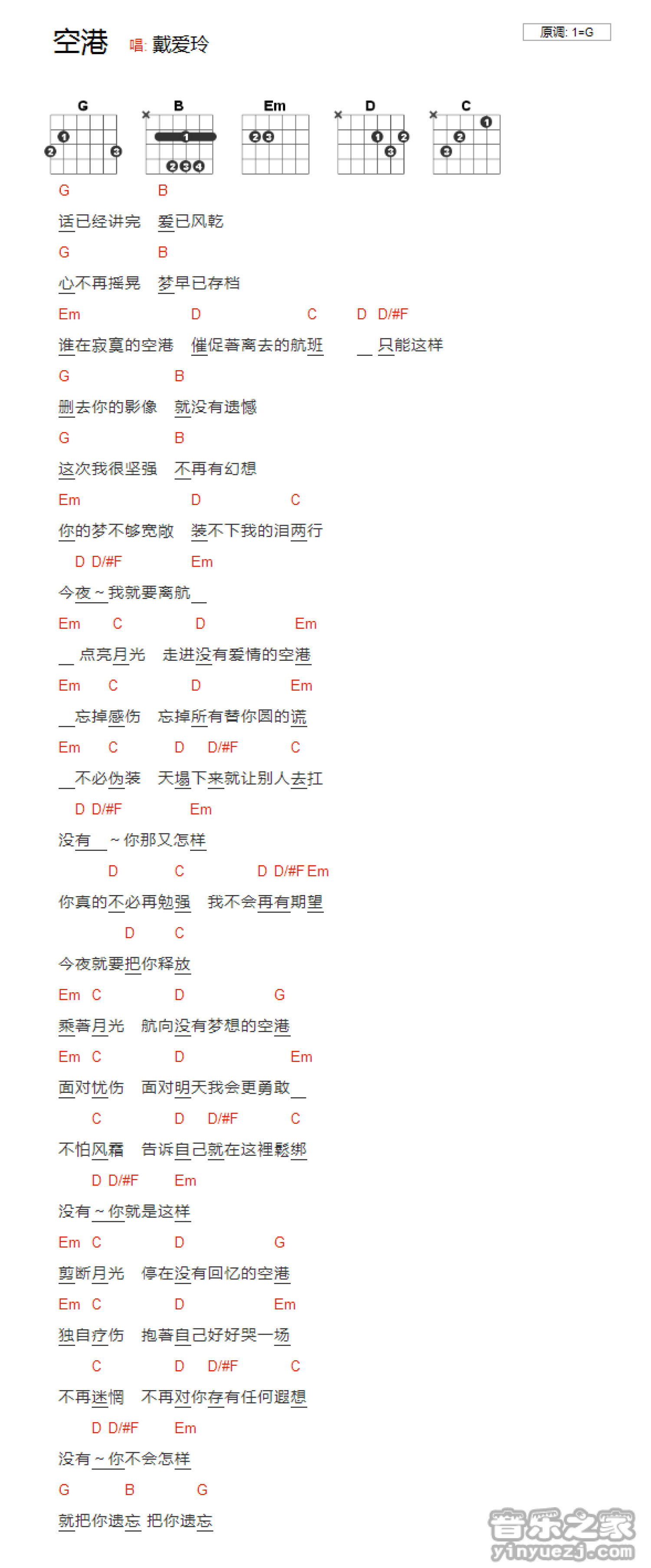 空港吉他谱 - 戴爱玲 - G调吉他弹唱谱 - 和弦谱