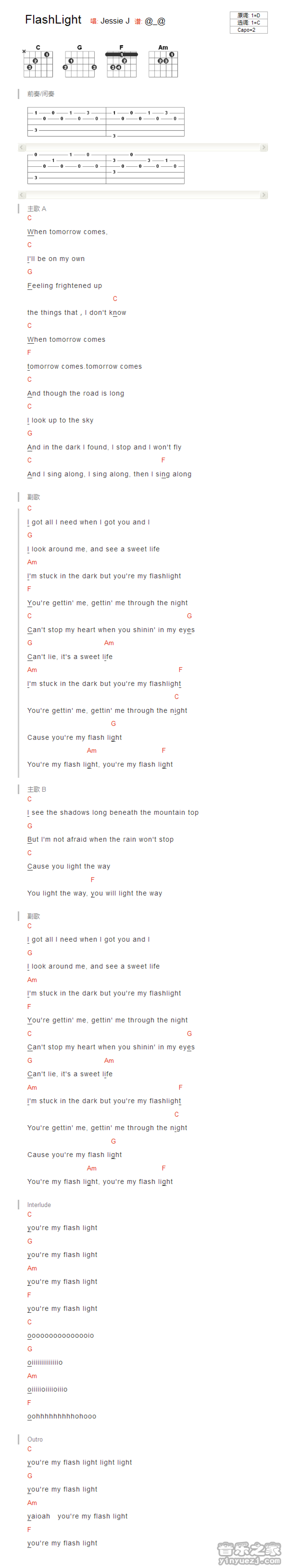 曲谱介绍: C调版《FlashLight》吉他谱_和弦弹唱谱