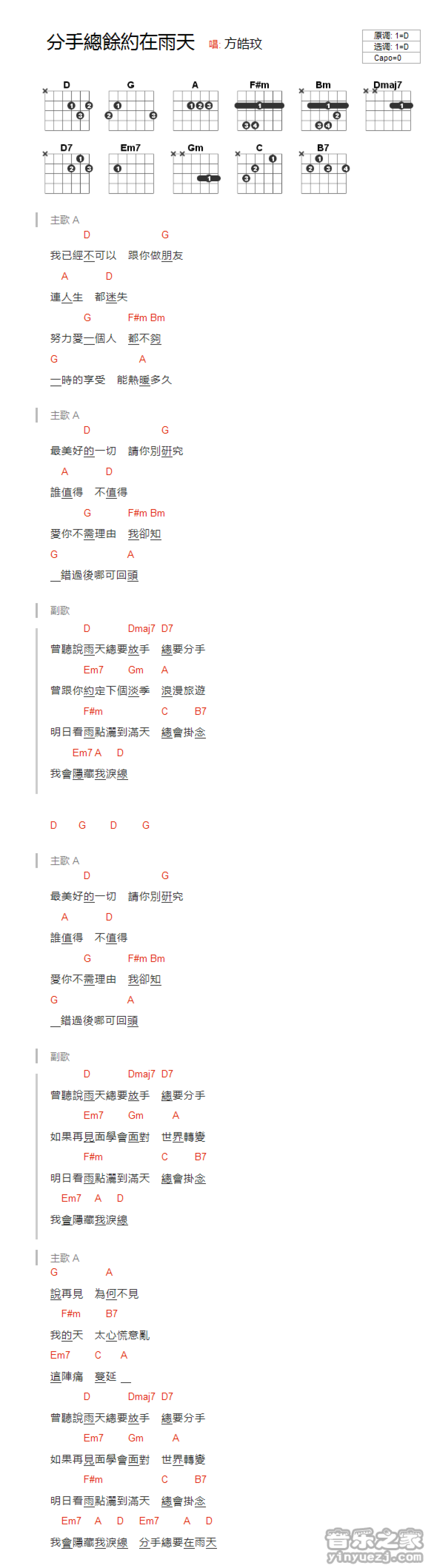 分手总约在雨天吉他谱 - 方皓玟 - D调吉他弹唱谱 - 和弦谱