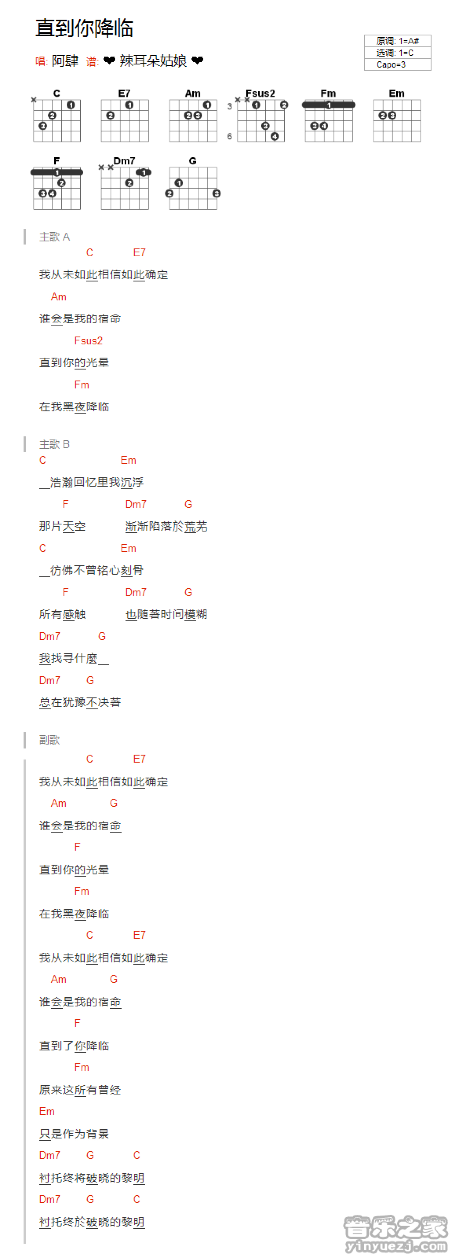 曲谱介绍: C调版《直到你降临》吉他和弦弹唱谱