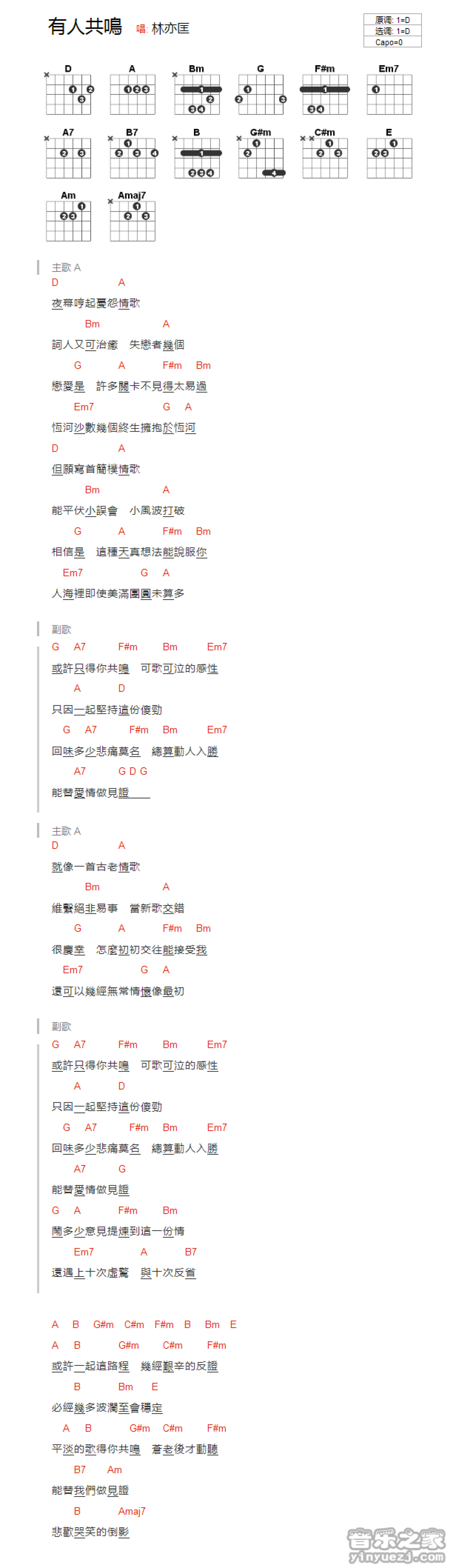 有人共鸣吉他谱 - 林亦匡 - D调吉他弹唱谱 - 和弦谱