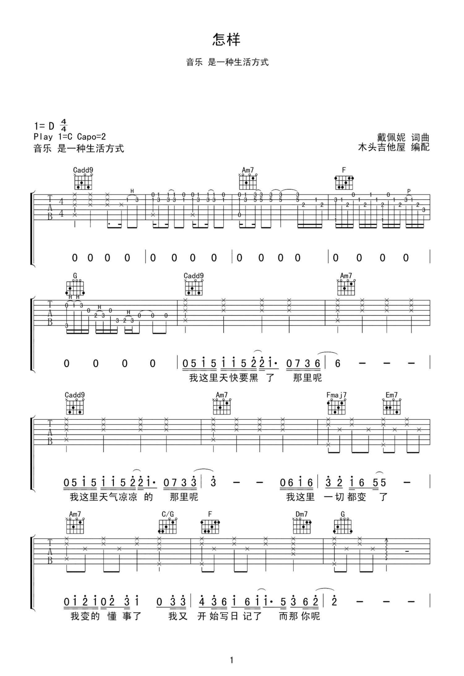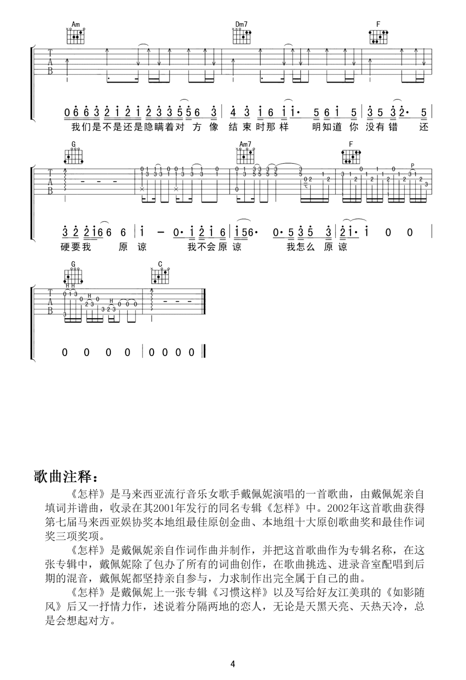 曲谱介绍: 戴佩妮《怎样》吉他谱_C调吉他弹唱谱