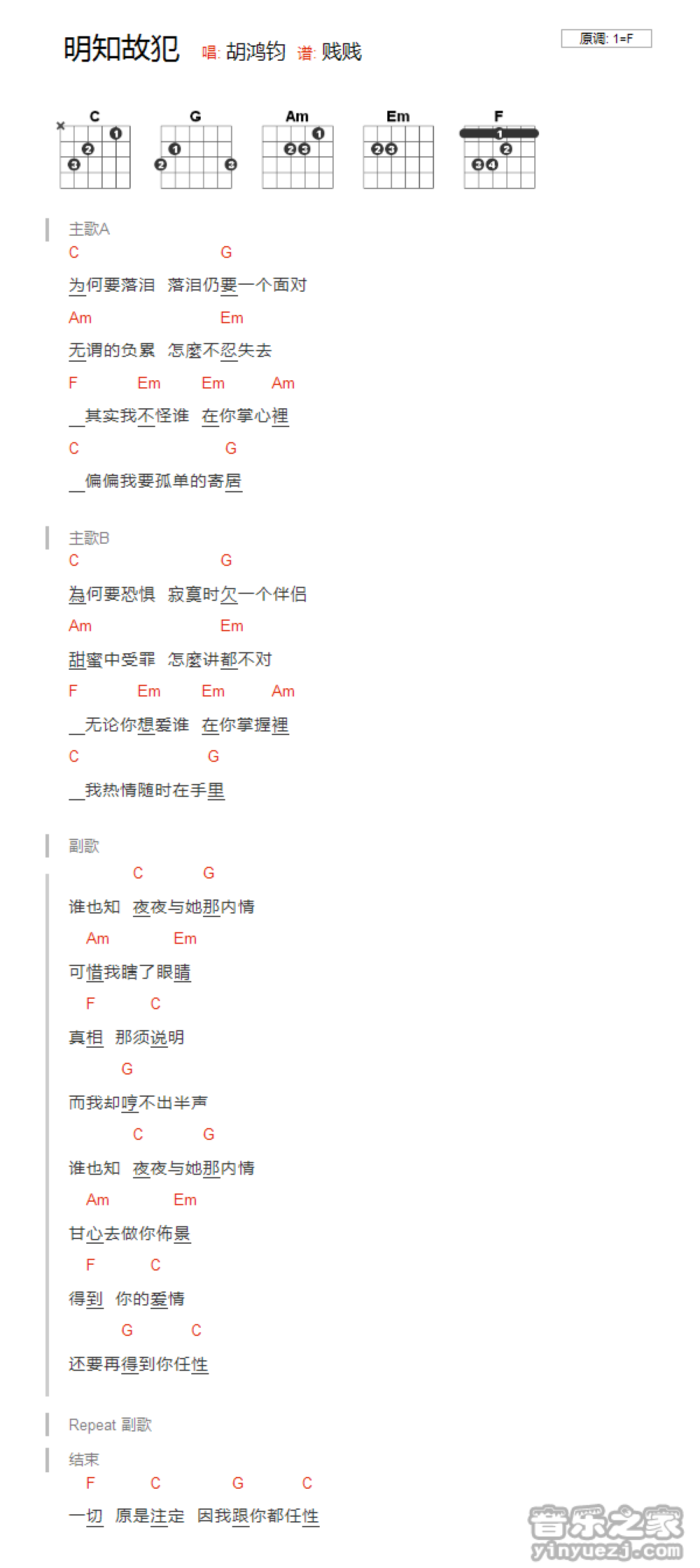 曲谱介绍: F调版《名字故犯》吉他和弦弹唱谱
