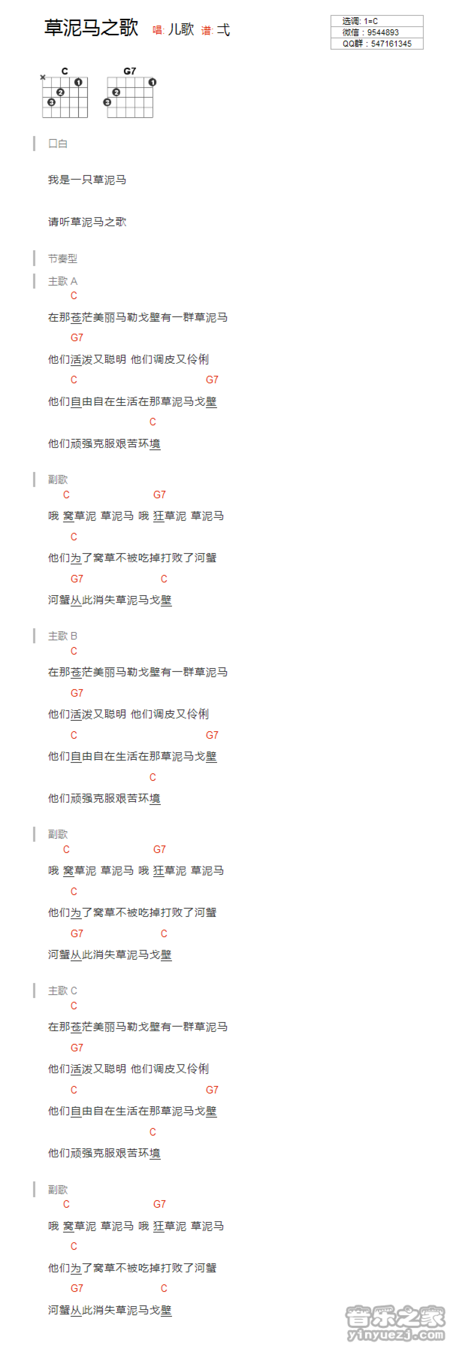 草泥马之歌吉他谱 - 儿歌 - C调吉他弹唱谱 - 和弦谱