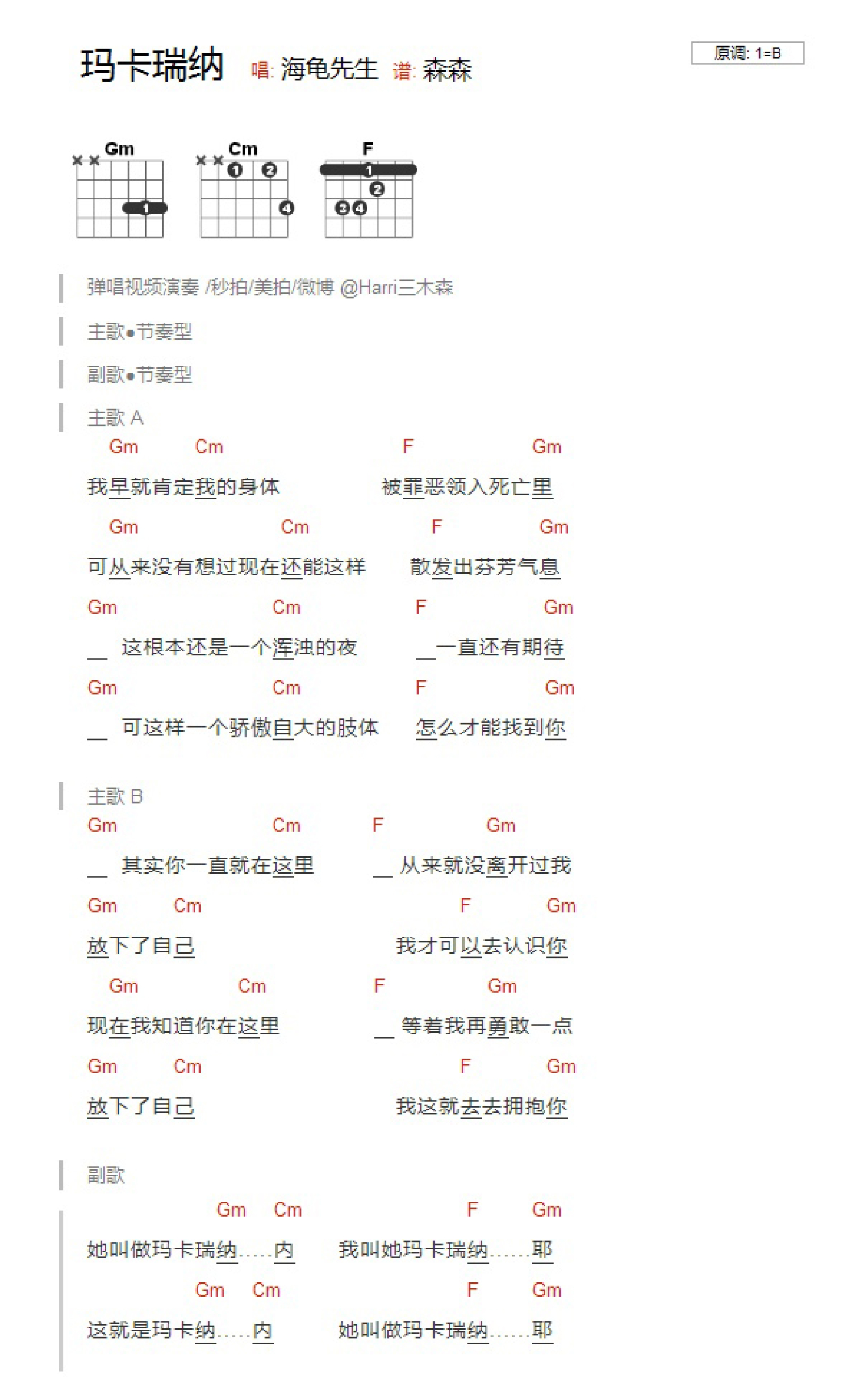 玛卡瑞纳吉他谱 - 海龟先生 - B调吉他弹唱谱 - 和弦谱