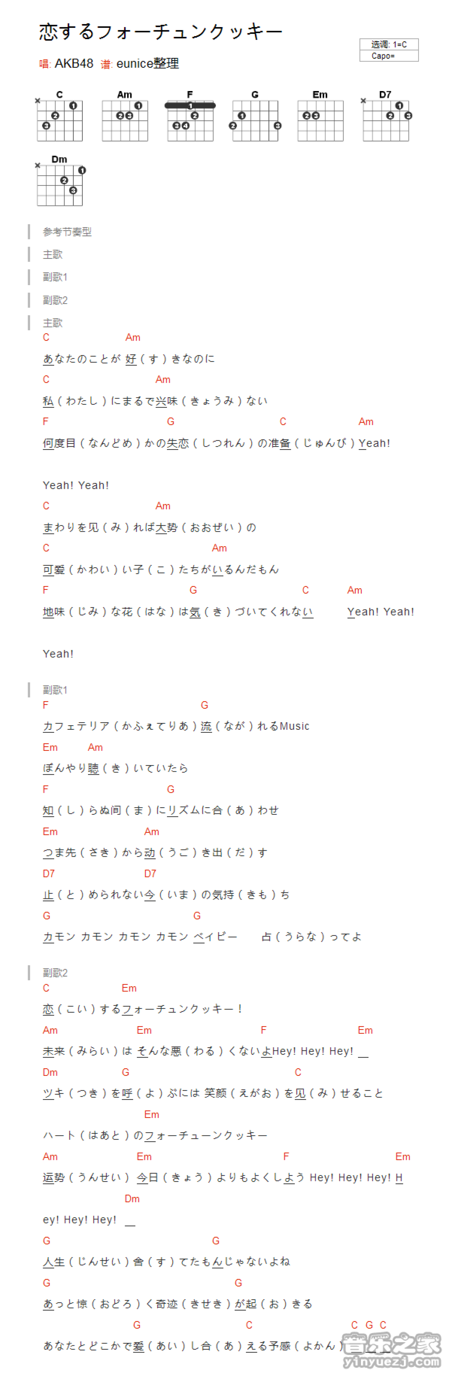 恋爱幸运曲奇吉他谱 - AKB48 - C调吉他弹唱谱 - 和弦谱