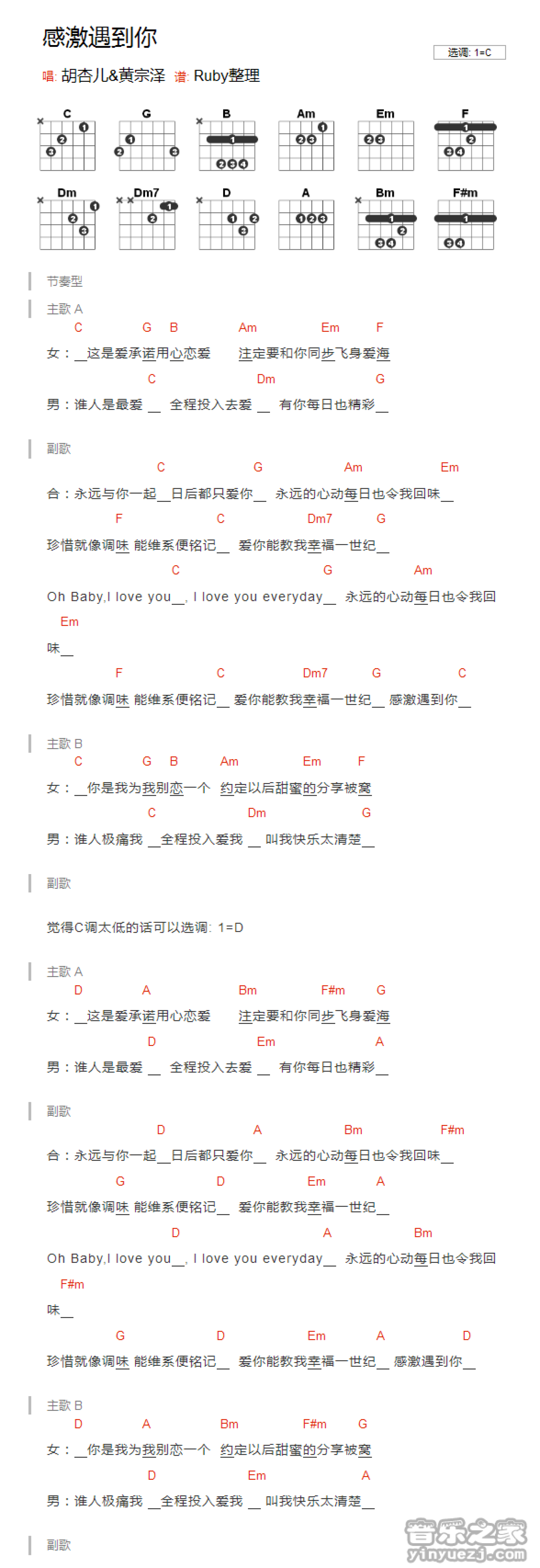 曲谱介绍: C调版《感激遇到你》吉他和弦弹唱谱