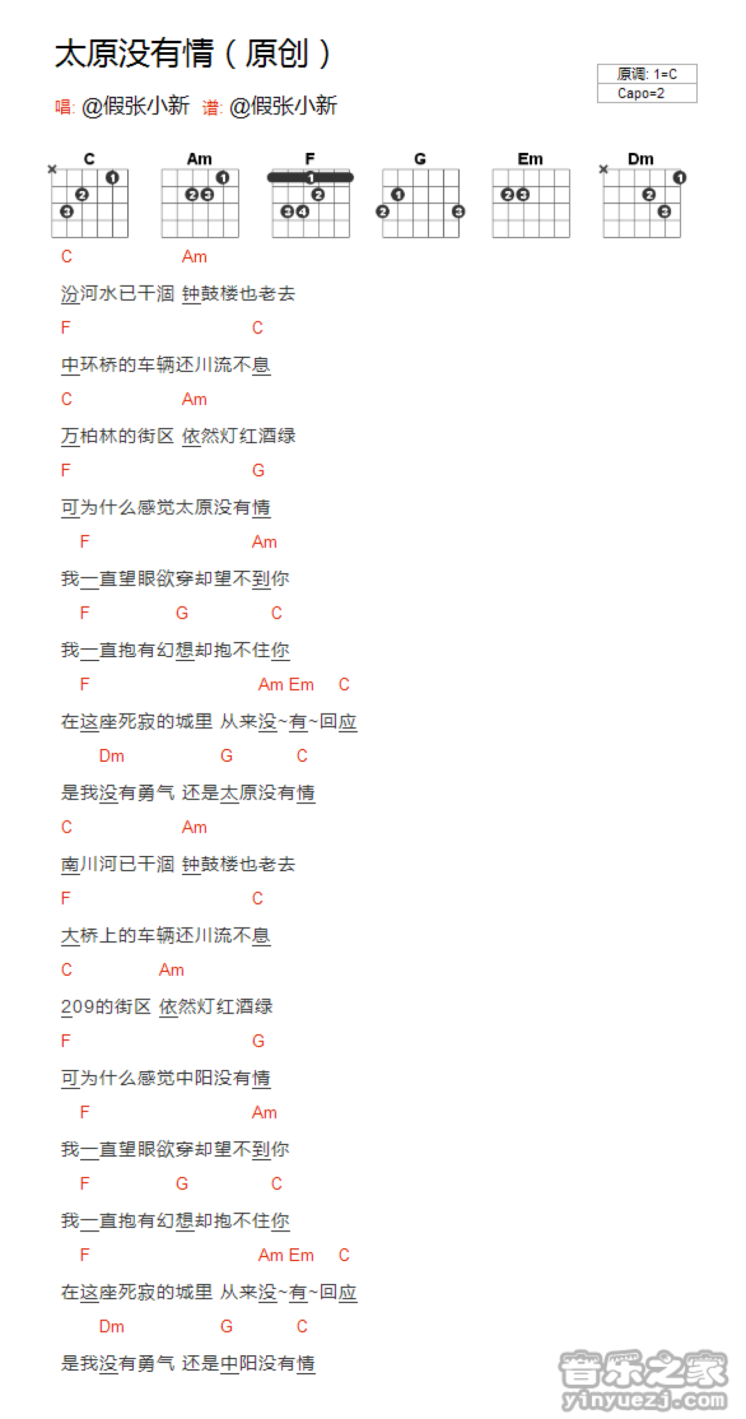 曲谱介绍: C调版原创歌曲《太原没有情》吉他和弦弹唱谱