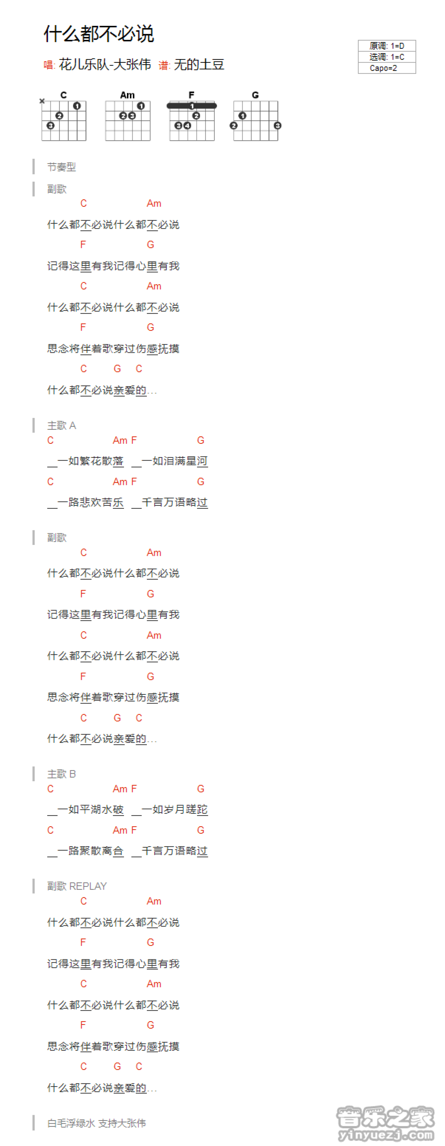 曲谱介绍: C调版《什么都不必说》吉他和弦弹唱谱
