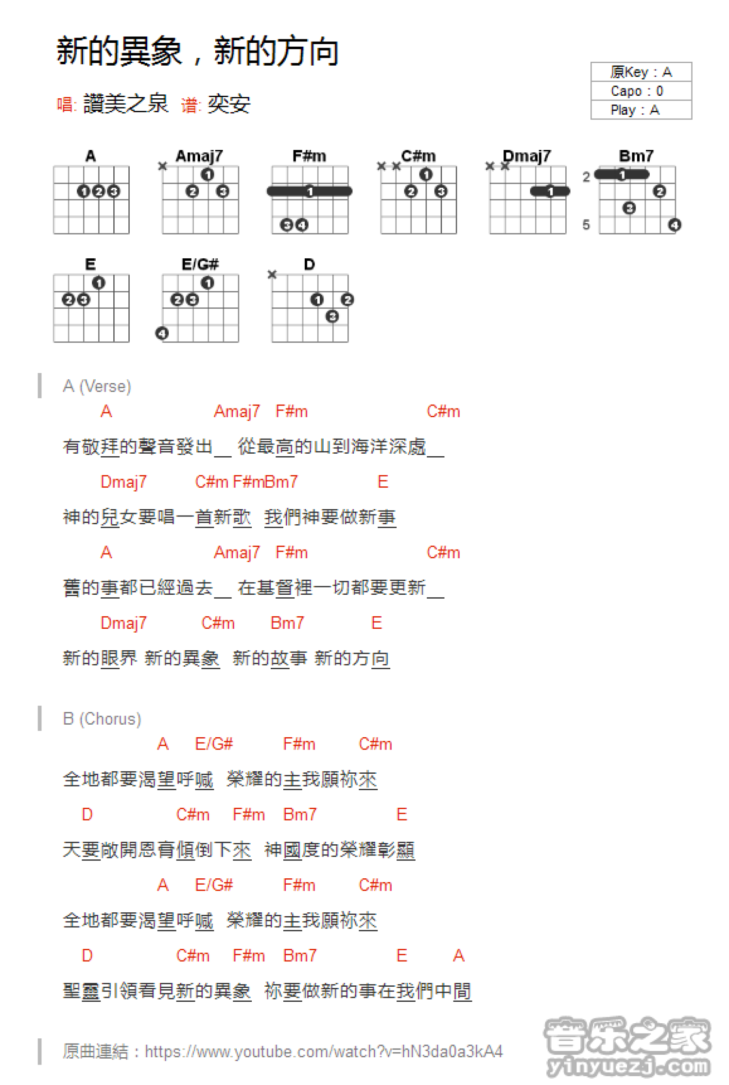 曲谱介绍: A调版《新的异象新的方向》吉他和弦弹唱谱