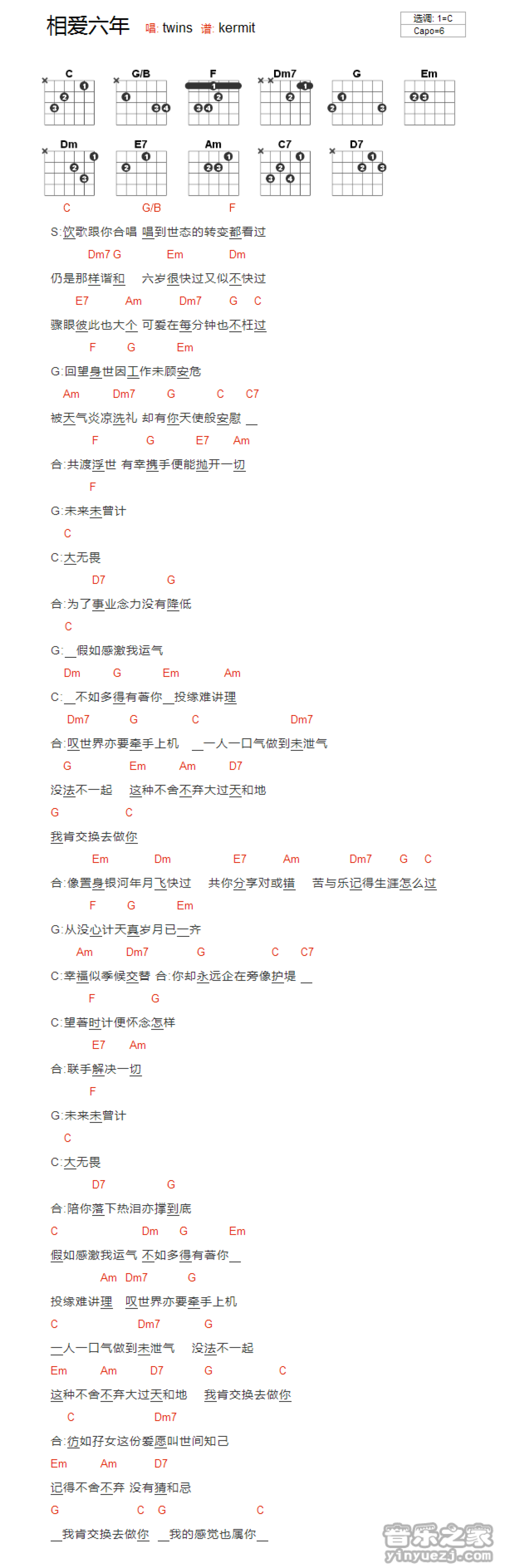 相爱六年吉他谱 - twins - C调吉他弹唱谱 - 和弦谱