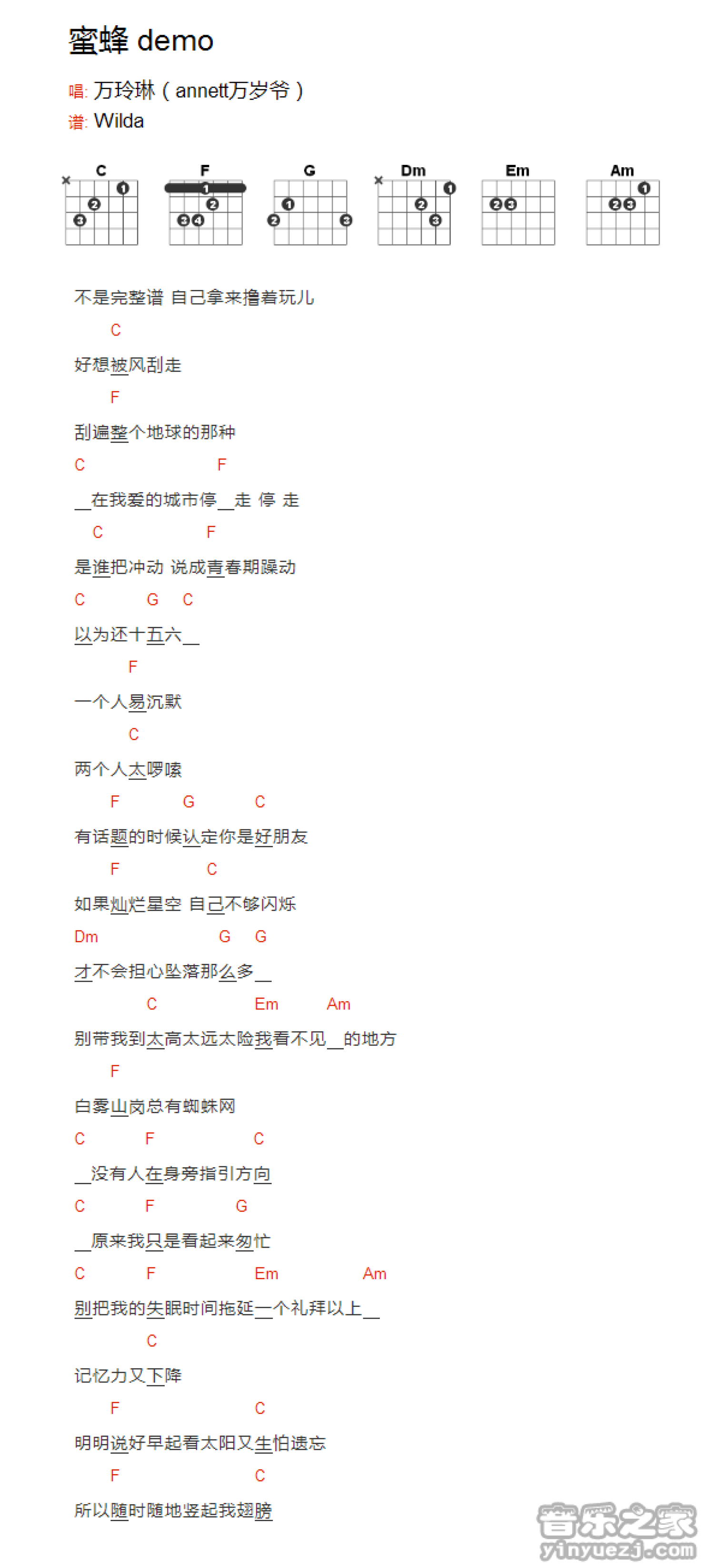 曲谱介绍: C调版《蜜蜂demo》吉他和弦弹唱谱