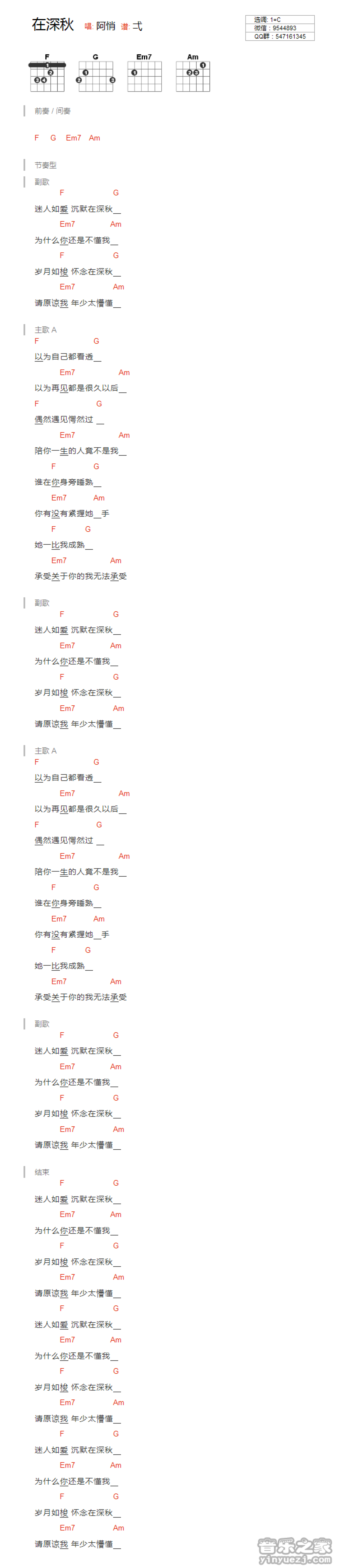 曲谱介绍: 《在深秋》吉他和弦弹唱谱