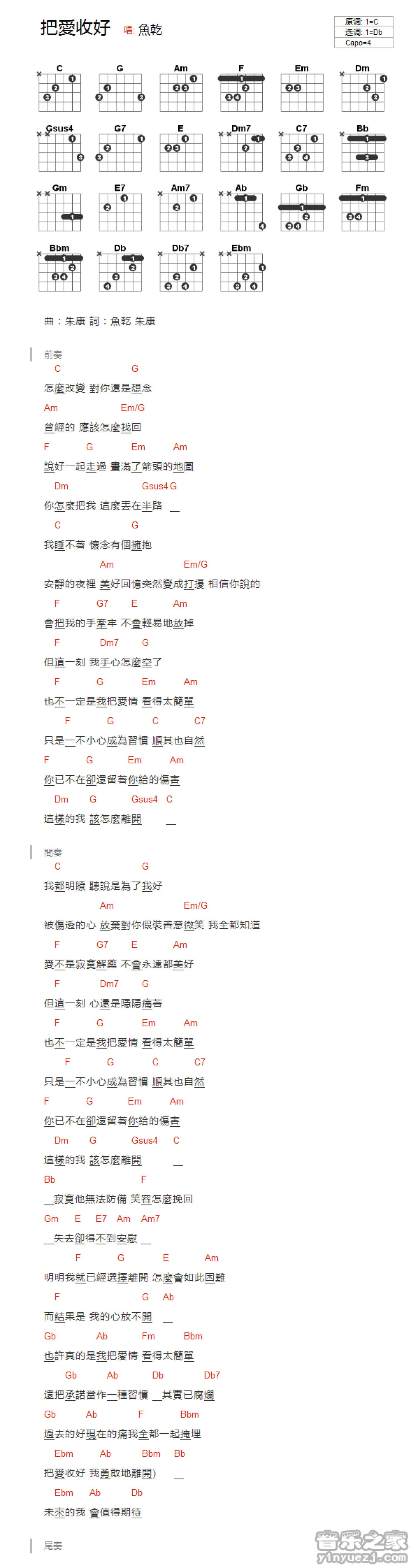曲谱介绍: bD调版鱼干《把爱收好》吉他和弦弹唱谱