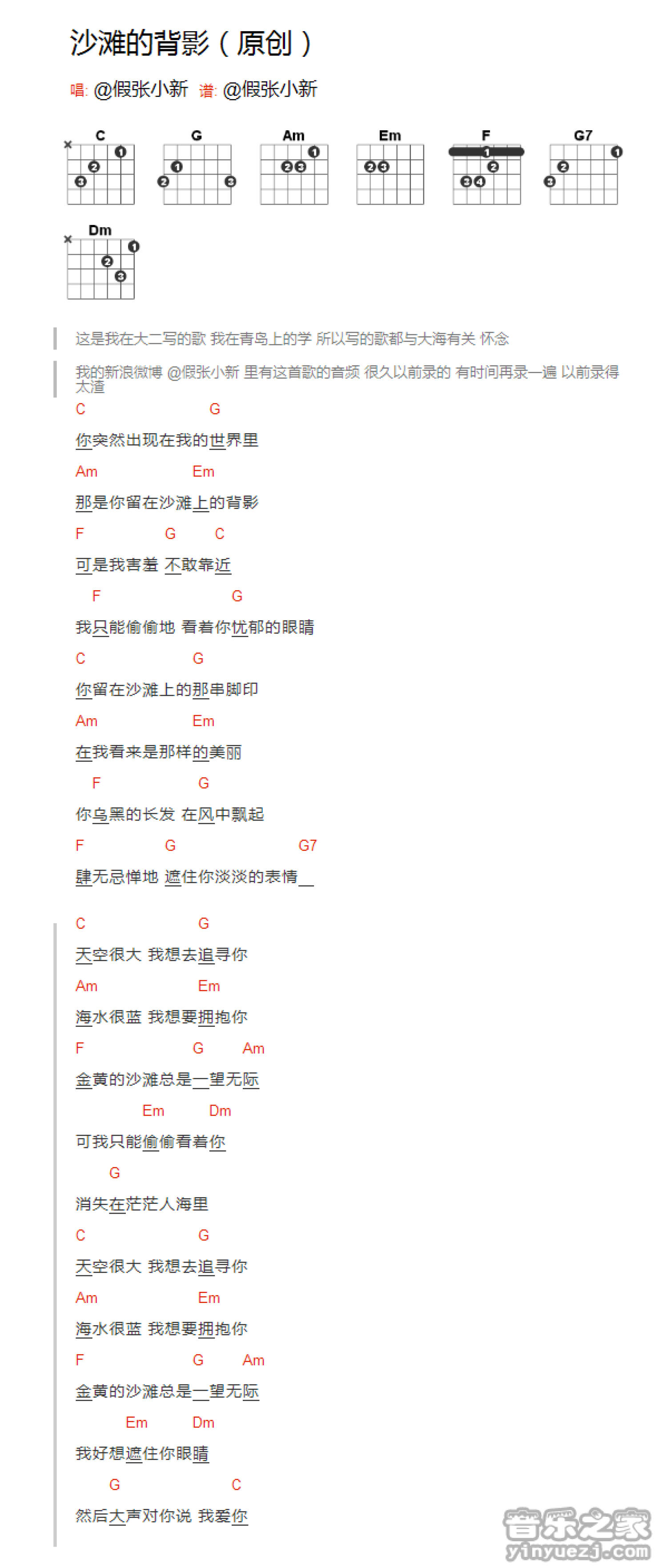 曲谱介绍: 《沙滩的背影》吉他和弦弹唱谱