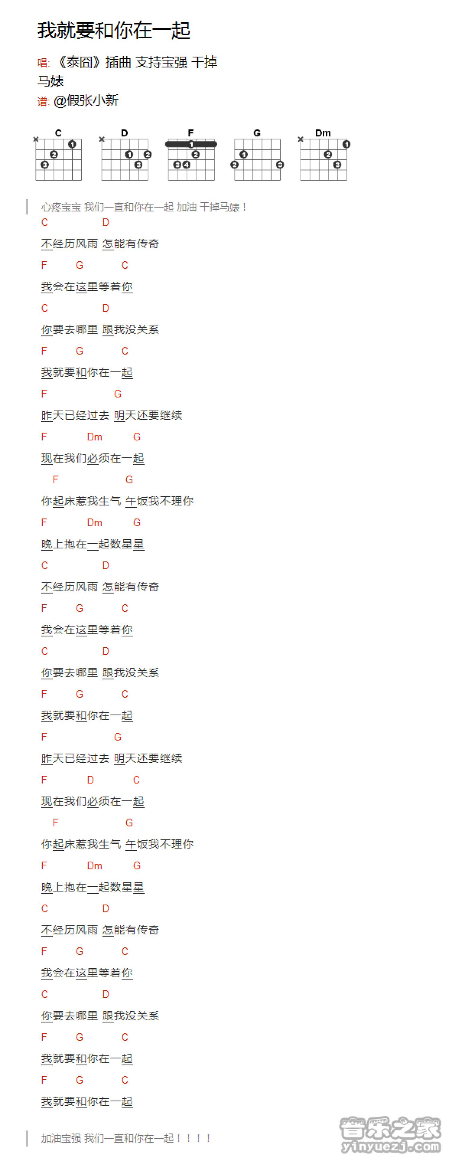 曲谱介绍: C调版赵英俊《我就要和你在一起》吉他和弦弹唱谱