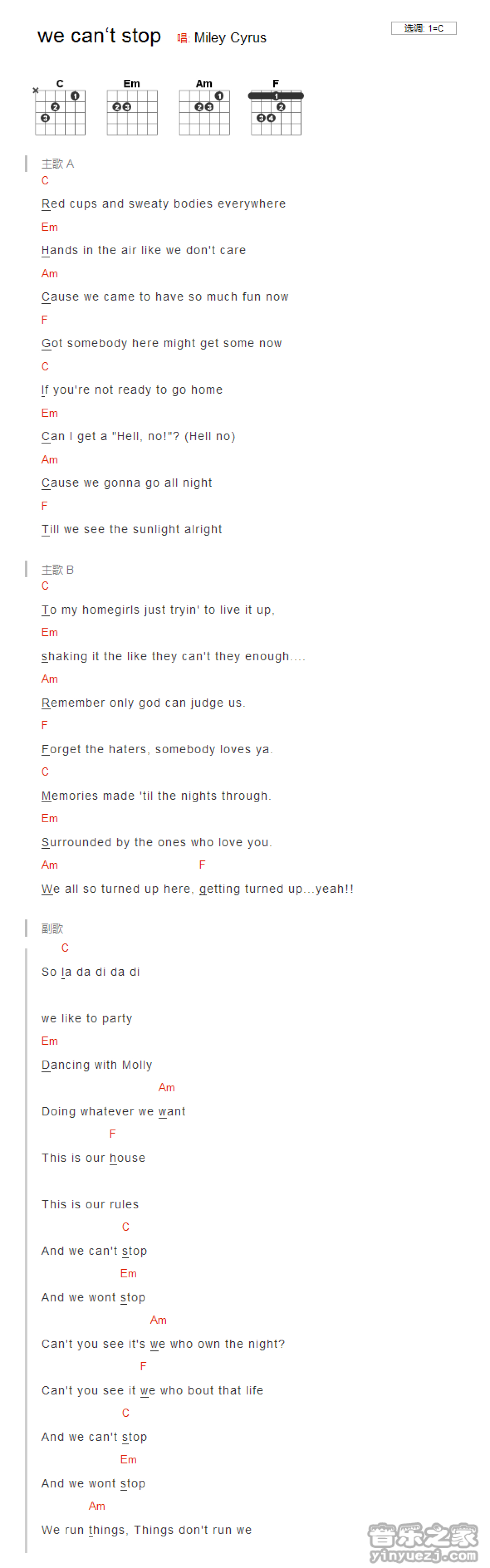 曲谱介绍: C调版《wecan'tstop》吉他和弦弹唱谱