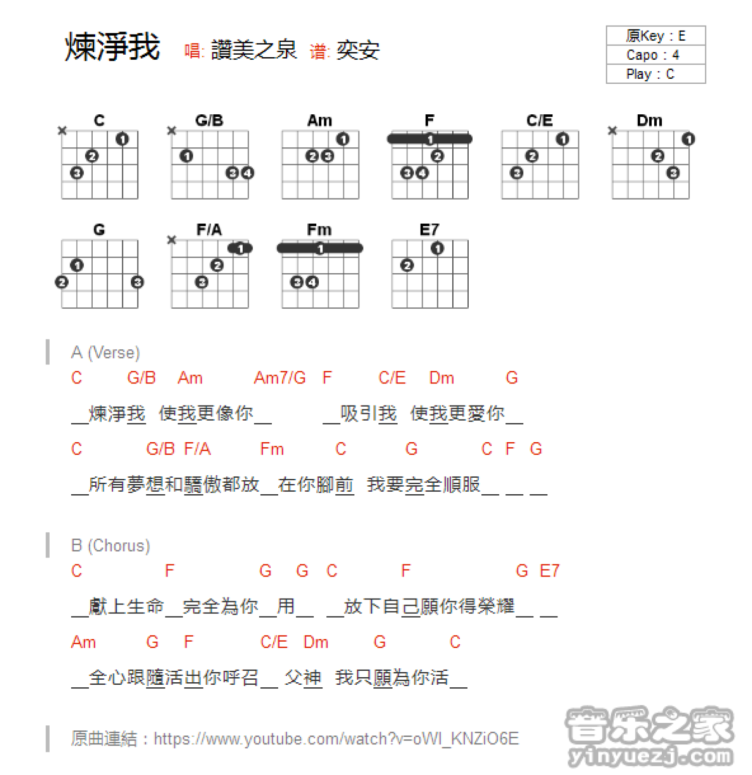 曲谱介绍: C调版赞美之泉《炼净我》吉他和弦弹唱谱