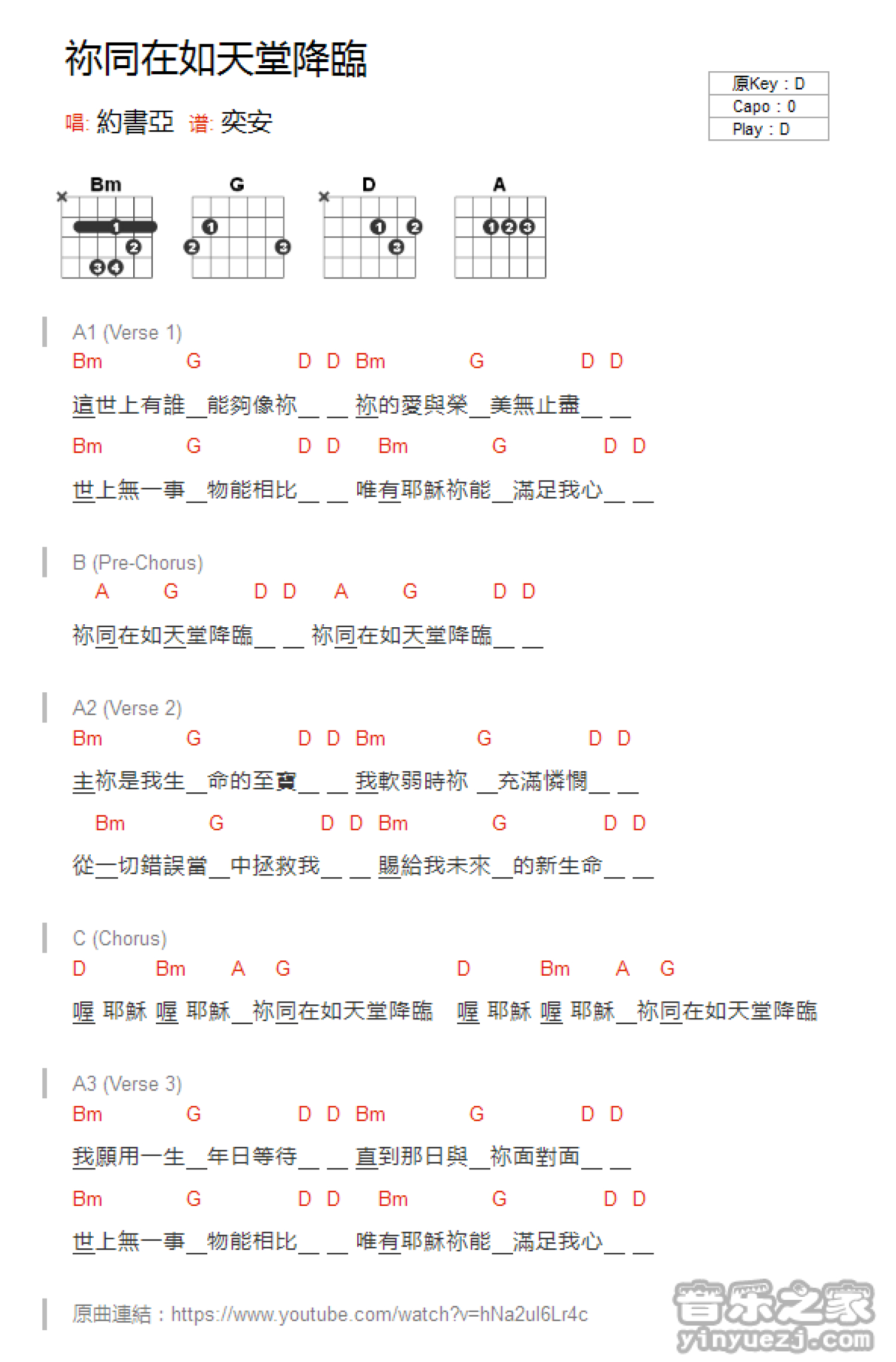 曲谱介绍: D调版约书亚《你同在如天堂降临》吉他和弦弹唱谱