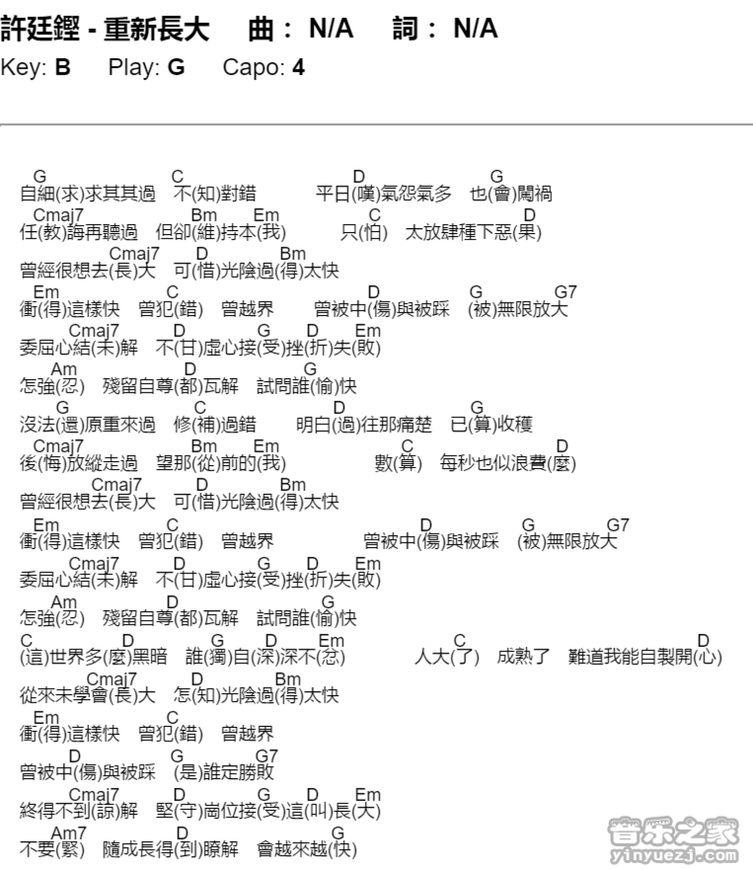 曲谱介绍: G调版许廷铿《重新长大》吉他和弦弹唱谱