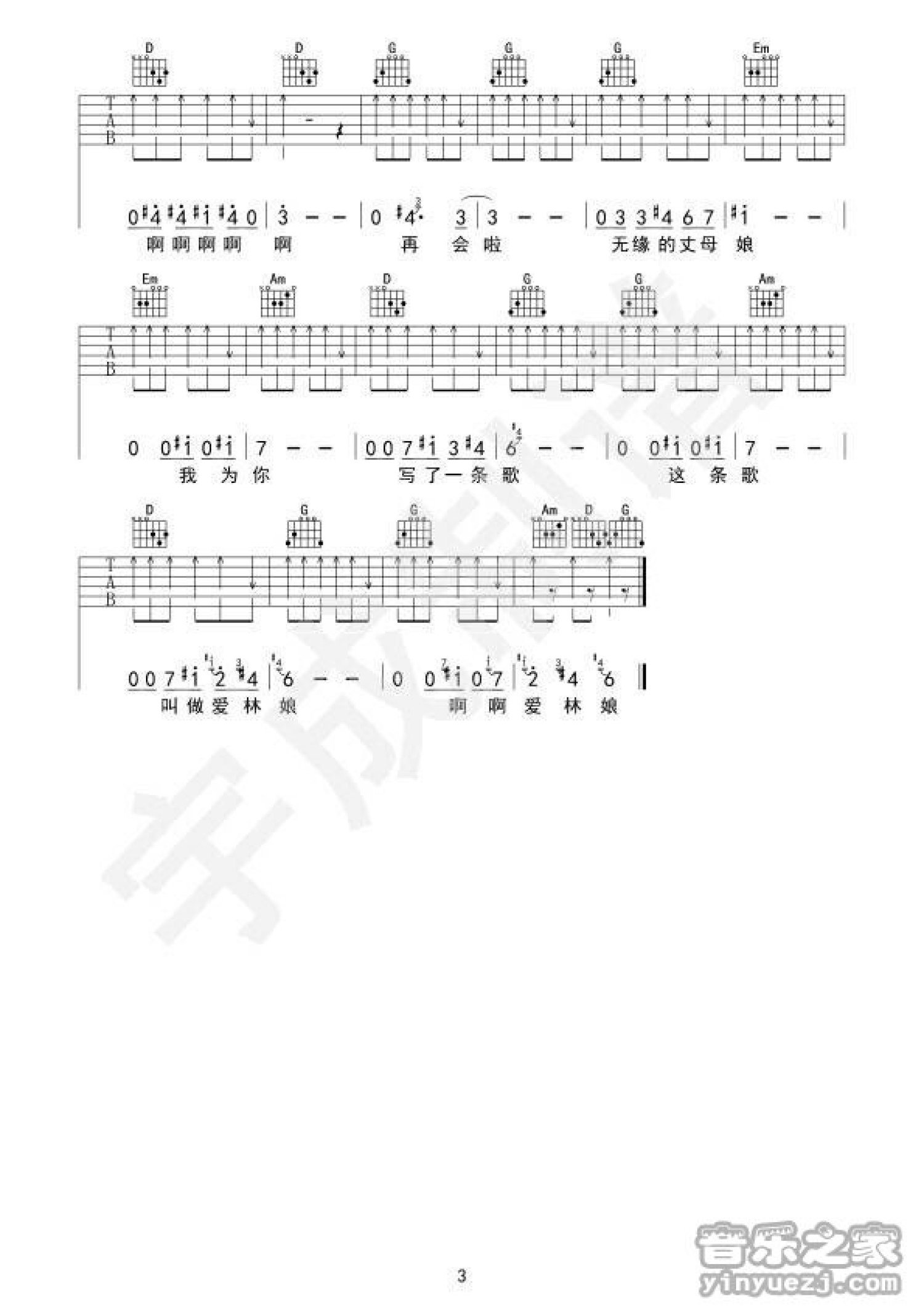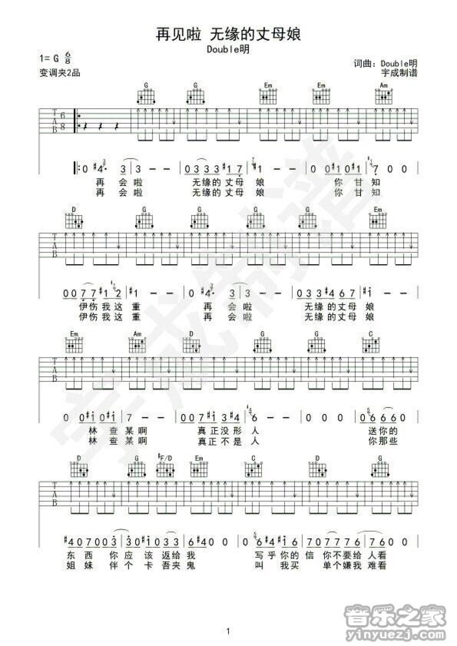 曲谱介绍: G调版Double明《再会啦无缘的丈母娘》吉他弹唱六线谱