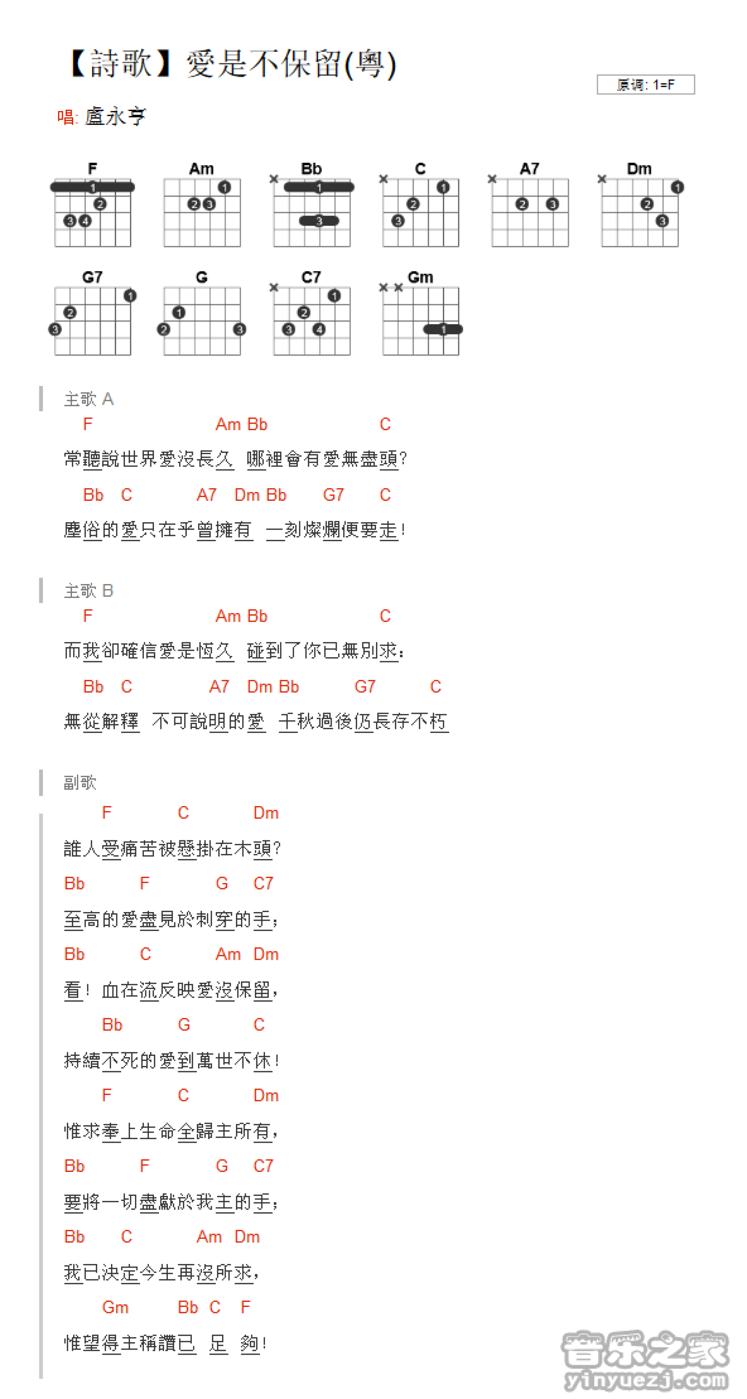 曲谱介绍: F调版卢永亨《爱是不保留》吉他和弦弹唱谱